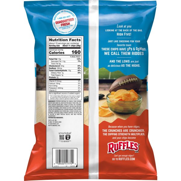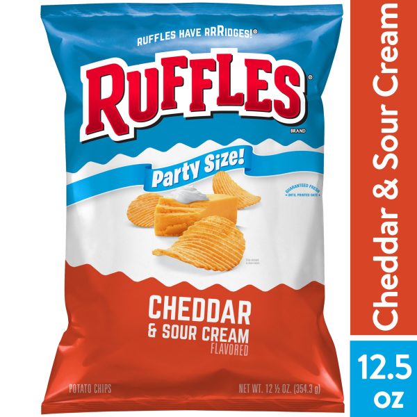 Ruffles Cheddar & Sour Cream Flavored Potato Chips have bold, thick and deep ridges to hold more of the real cheddar cheese & sour cream flavor you love. They’re strong enough to withstand any dip. These big bags are convenient and perfect for sharing some delicious fun at home.