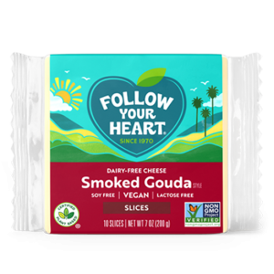 Cheese Alternative, Smoked Gouda, Slices, Wrapper 10 CT All new! Vegan. Lactose free. Casein free. Soy free. Non-GMO. www.followyourheart.com. Product of Greece. Perishable. Keep refrigerated. Do not freeze. 10 slices [7 oz (200 g)] Chatsworth, CA 91311 888-394-3949