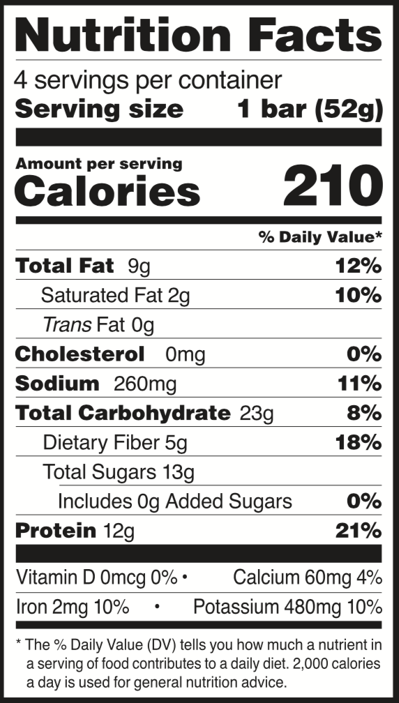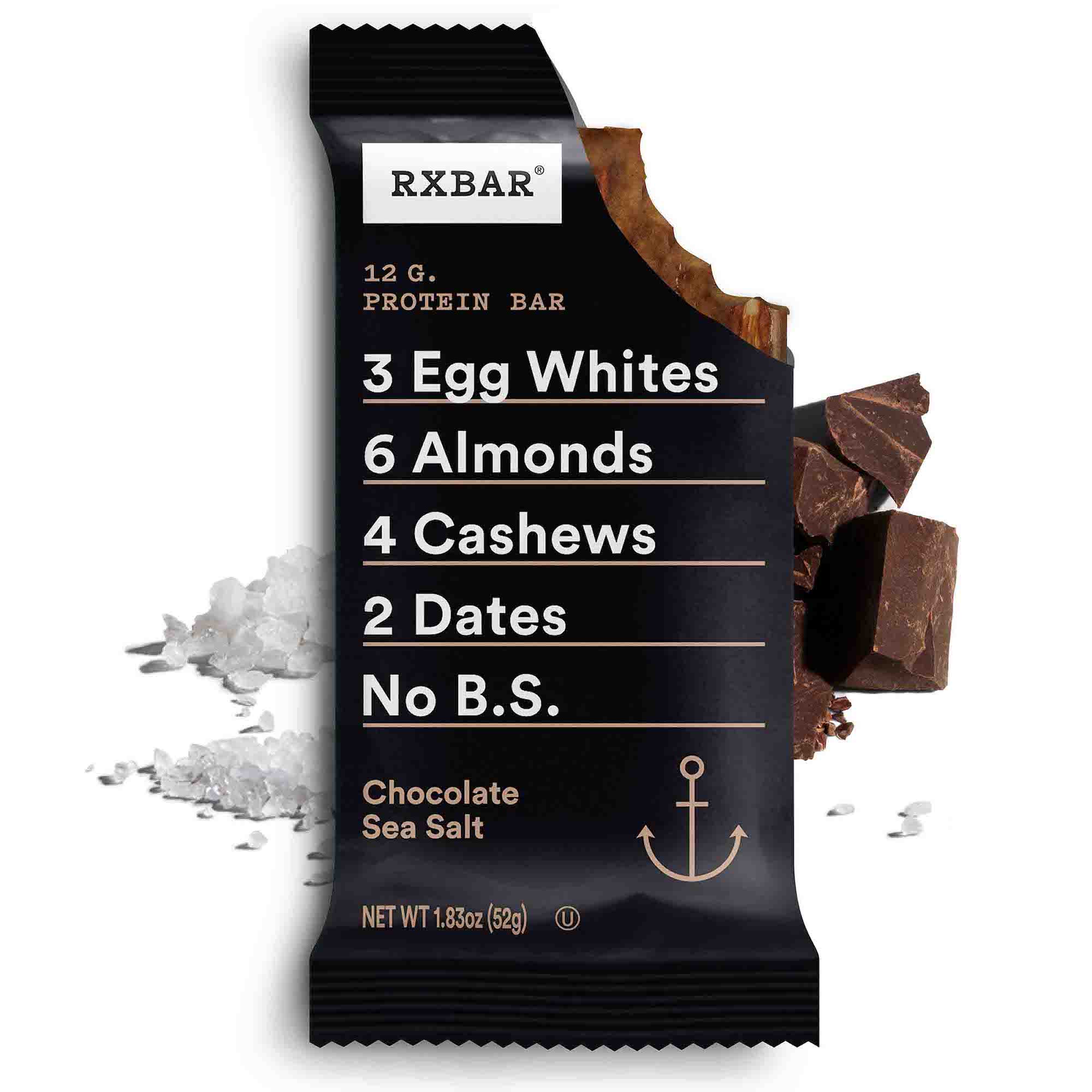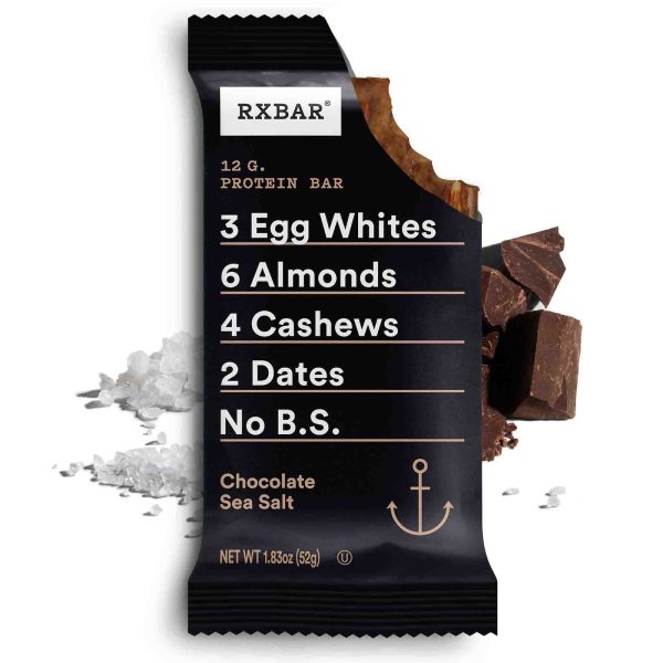 A real food protein bar: We made a brownie without the guilt or gluten. Our Chocolate Sea Salt RXBAR is the perfect protein bar for any brownie lover. Packed with 100% chocolate, a sprinkle of sea salt and a few real food ingredients egg whites for protein, dates to bind and nuts for texture. 12g of protein. 5g fiber. Gluten free. This decadent wholesome protein bar is truly one of a kind.