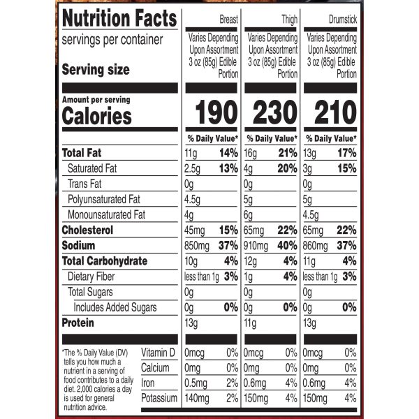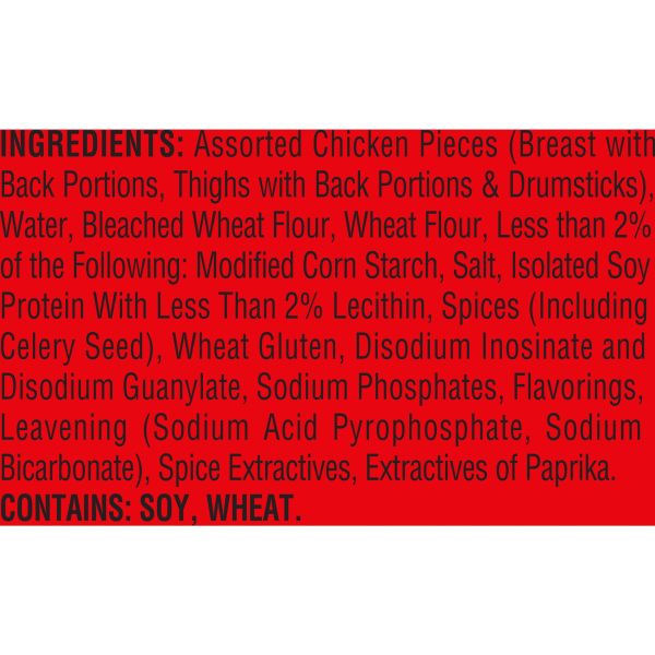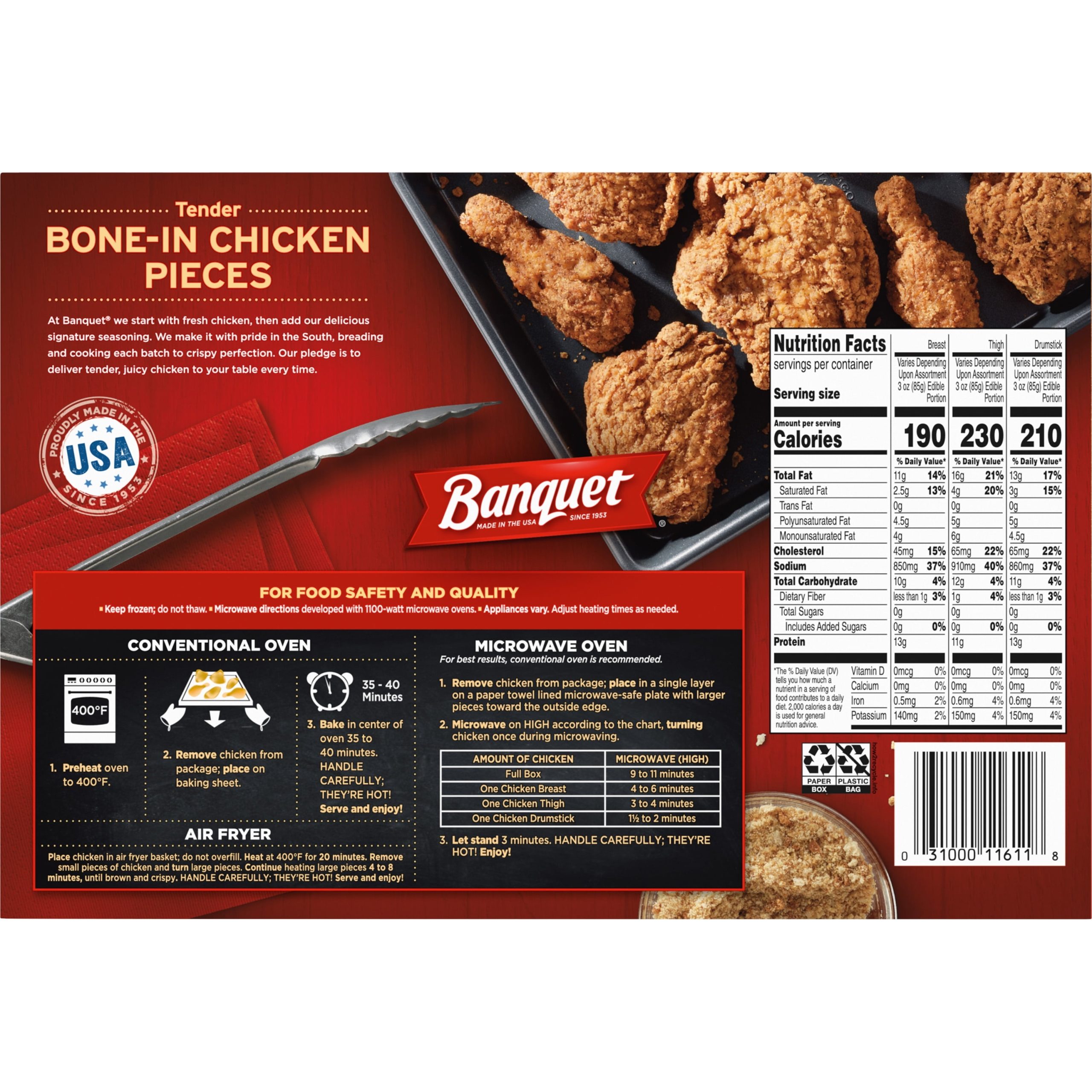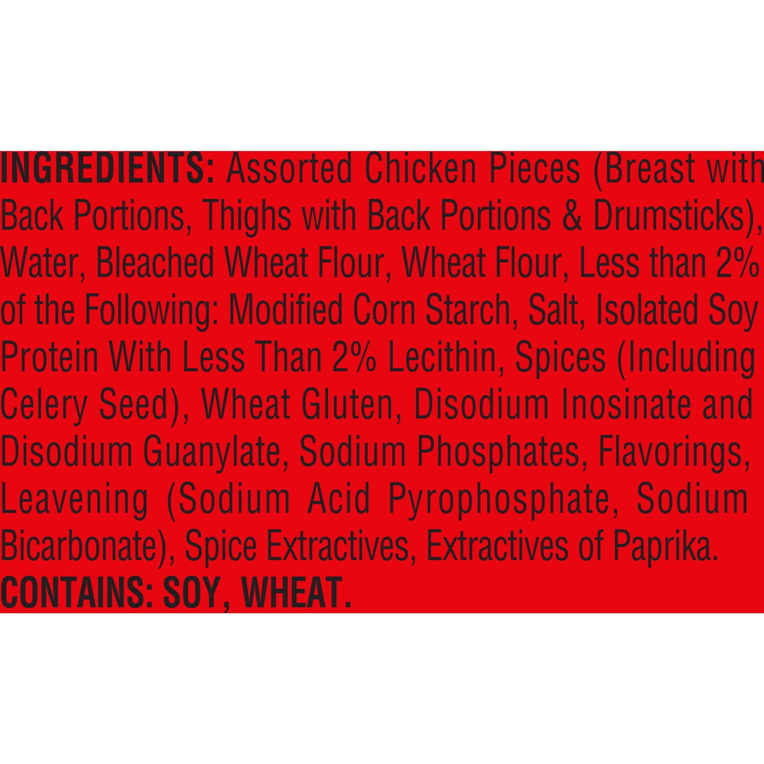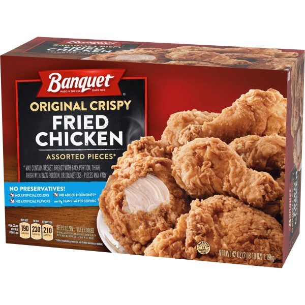 Watch friends and family flock to the table when you serve a 42-ounce box of BANQUET Original Crispy Fried Chicken Tender Bone-In Chicken Assorted Pieces*. Starting with fresh chicken, such as assorted chicken breast, chicken thigh and drumstick pieces, BANQUET adds its delicious signature seasoning before breading and cooking each batch to crispy perfection. Is your mouth watering yet? Serve this tender, juicy chicken with a side of mashed potatoes or green beans for a satisfying meal everyone will enjoy. BANQUET frozen bone-in chicken pieces are fully cooked; simply heat in a convectional oven or microwave oven. Keep frozen; do not thaw. * May contain breast pieces with back portion, thigh pieces with back portion or drumsticks as pieces will vary