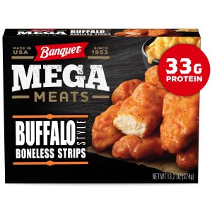 Some days you need a microwave meal that is just more, like Banquet Mega Meats Buffalo-Style Boneless Chicken Strips With Creamy Macaroni & Cheese. Delicious breaded white meat chicken strips are coated in spicy buffalo-style sauce with creamy macaroni and cheese for a bold and flavorful meal that is sure to satisfy even the heartiest of appetites. From freezer to table in minutes, these handy frozen meals are perfect for quick weeknight dinners or warm weekend meals. They are made with white meat chicken and no fillers, and provide 33 grams of protein per serving; now that’s MEGA!