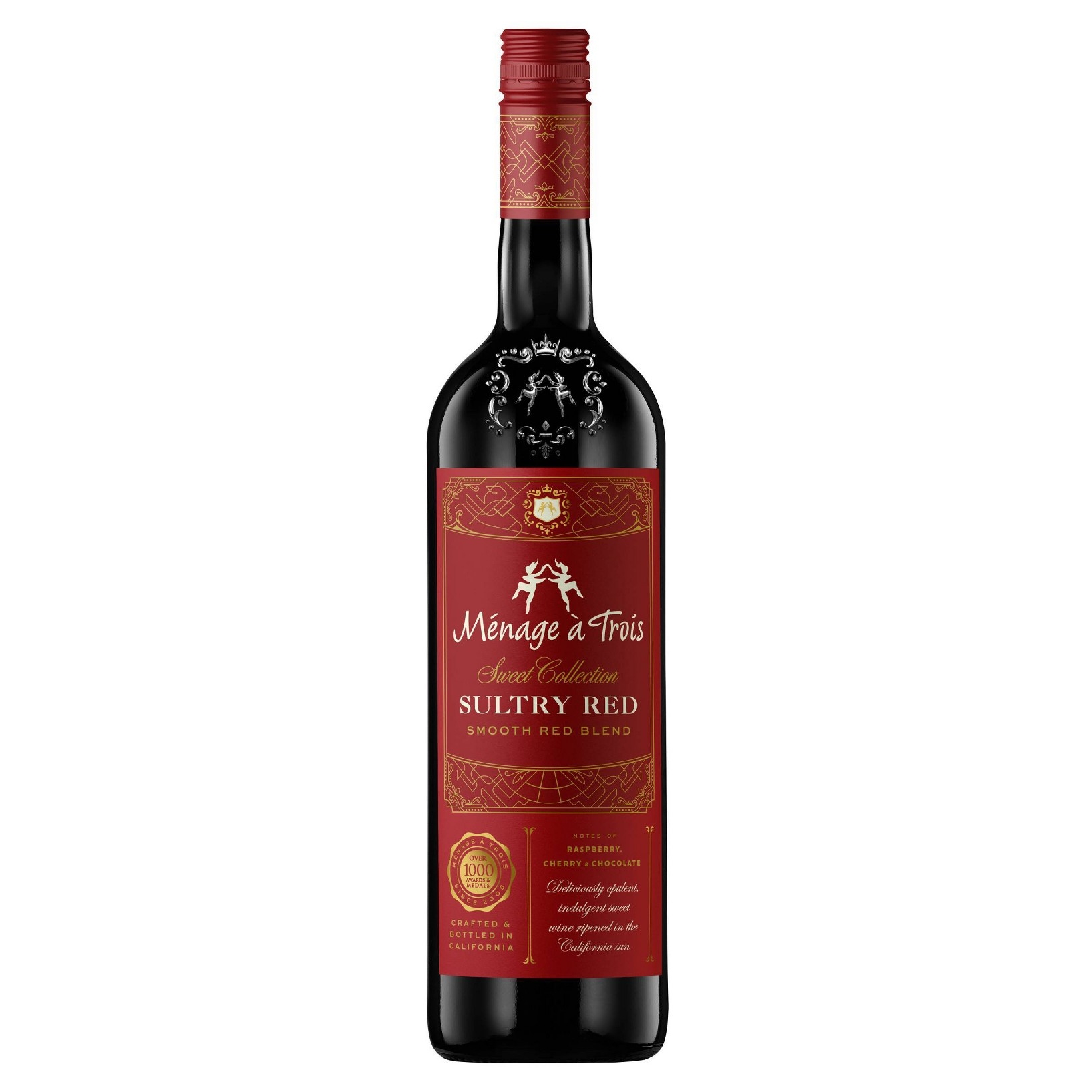 u0026bull;Brimming with lush berry aromas and layers of rich raspberry and dark cherry flavors wrapped in velvety chocolateu003cbru003eu0026bull;Silky and smooth with delightful bursts of carbonation, Sultry Red reminds you it’s always good to give in to temptationu003cbru003eu0026bull;Ménage à Trois has received over 1,000 awards u0026 medalsu003cbru003eu0026bull;When you’re craving a sweet encounter, Ménage à Trois Sultry Red Wine quenches your desire!u003cbru003eu0026bull;Crafted from grapes ripened in the California sunu003cbru003eu0026bull;Winemakers cap and drain the grapes to increase varietal intensity then enhance the blend with natural strawberry, rose and chocolate flavors. And if that wasn’t enough to drive you mad with desire, they’ve also elevated the wine with gentle carbonation for a truly unique experienceu003cbru003eu0026bull;One 750mL bottle of Ménage à Trois Sultry Red Blend contains, 9.65% ABV