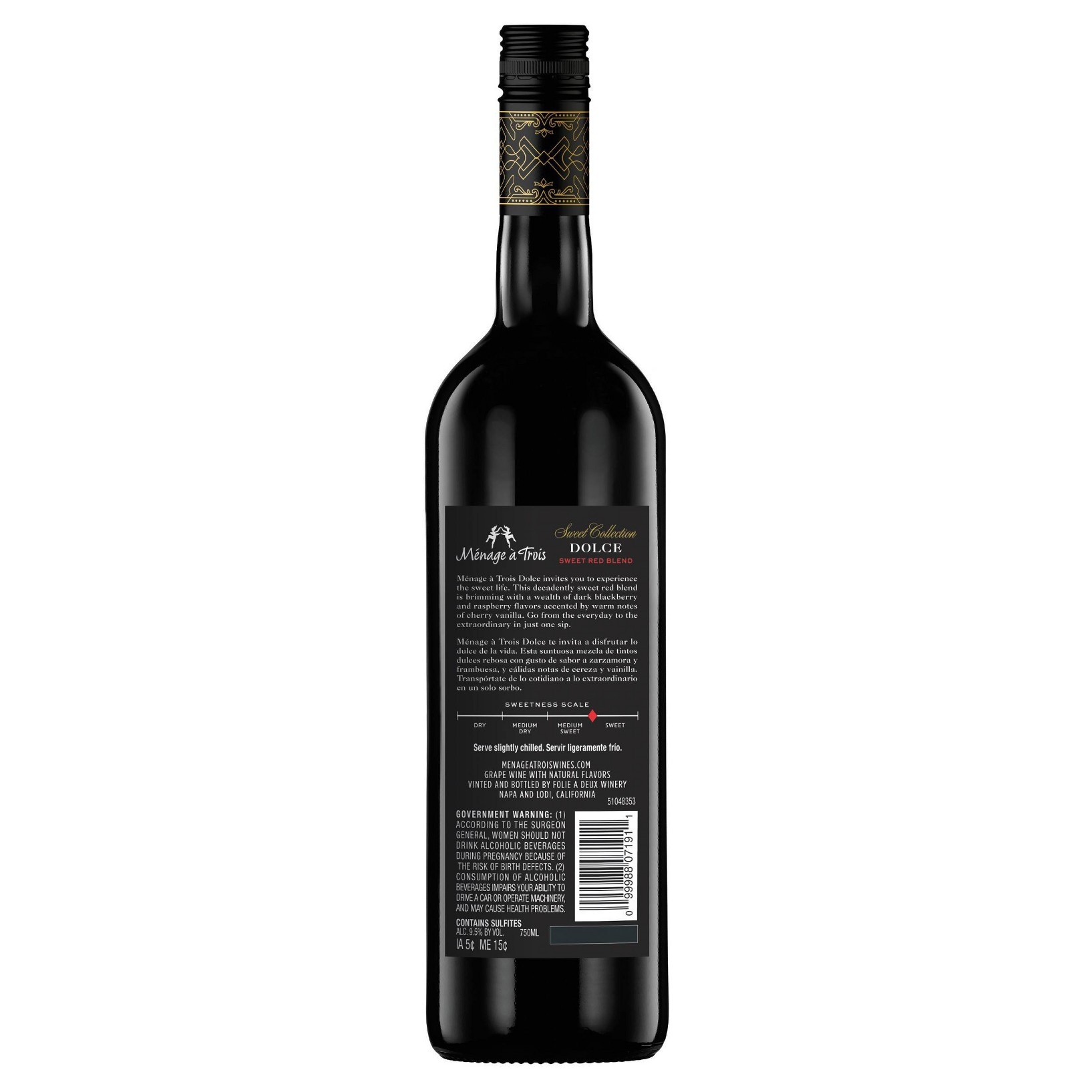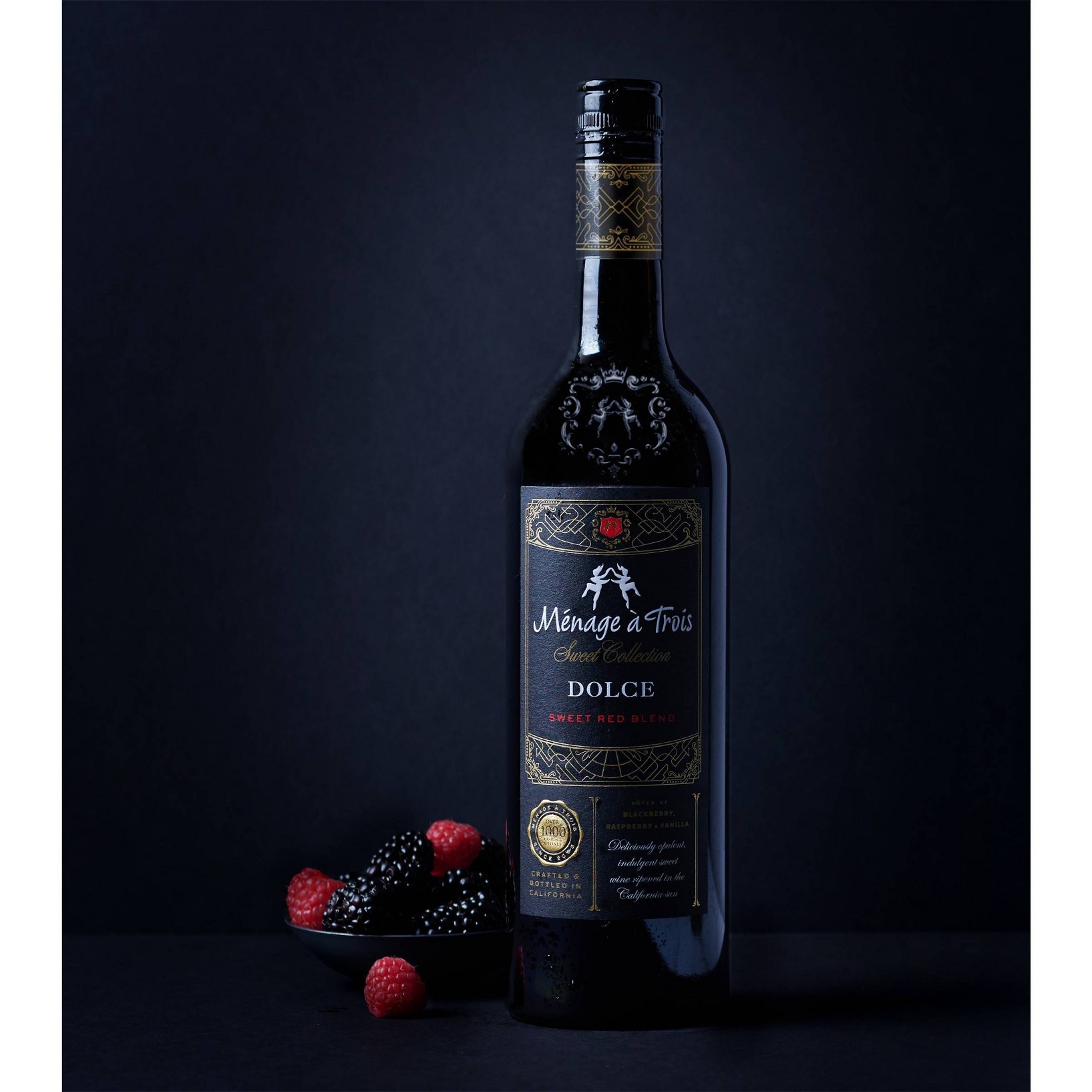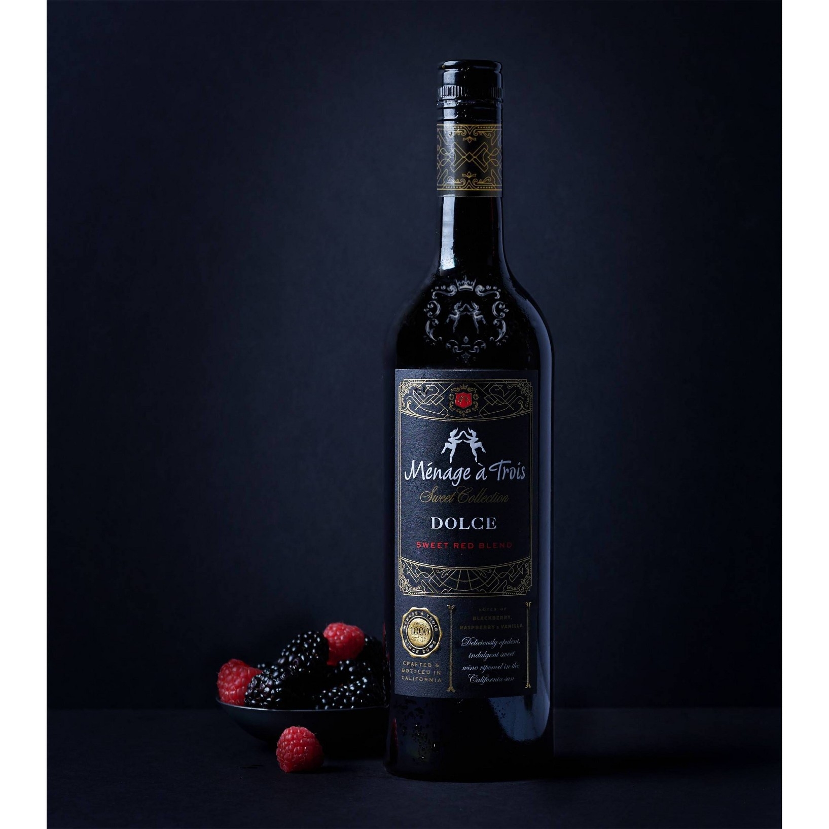 u0026bull;Lively on the palate with decadent blackberry and raspberry flavors accented by warm notes of vanillau003cbru003eu0026bull;Lightly carbonated red blend wine with crisp acidity, intensity and depthu003cbru003eu0026bull;Menage a Trois Dolce Sweet Red Wine was awarded 90 Points by the Tasting Panel in the April/May 2021 issueu003cbru003eu0026bull;Pair this sweet red wine blend with chocolate desserts and spicy meatsu003cbru003eu0026bull;Blend of red wines sourced from California vineyards that offer exceptionally indulgent flavors and bodyu003cbru003eu0026bull;Cold fermented to maintain the rich, sweet flavors and aromas of this red blendu003cbru003eu0026bull;One 750mL wine bottle of Menage a Trois Sweet Collection Dolce Sweet Red Wine, 9.5% ABV