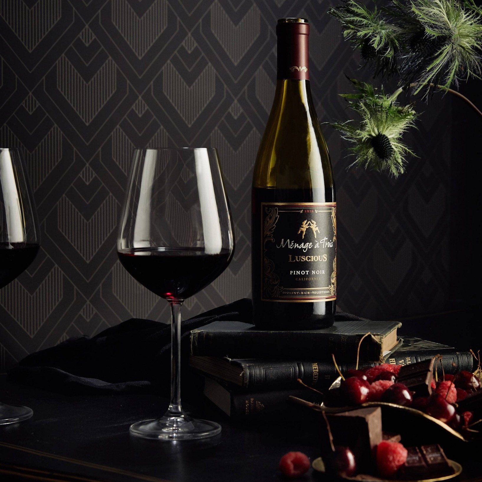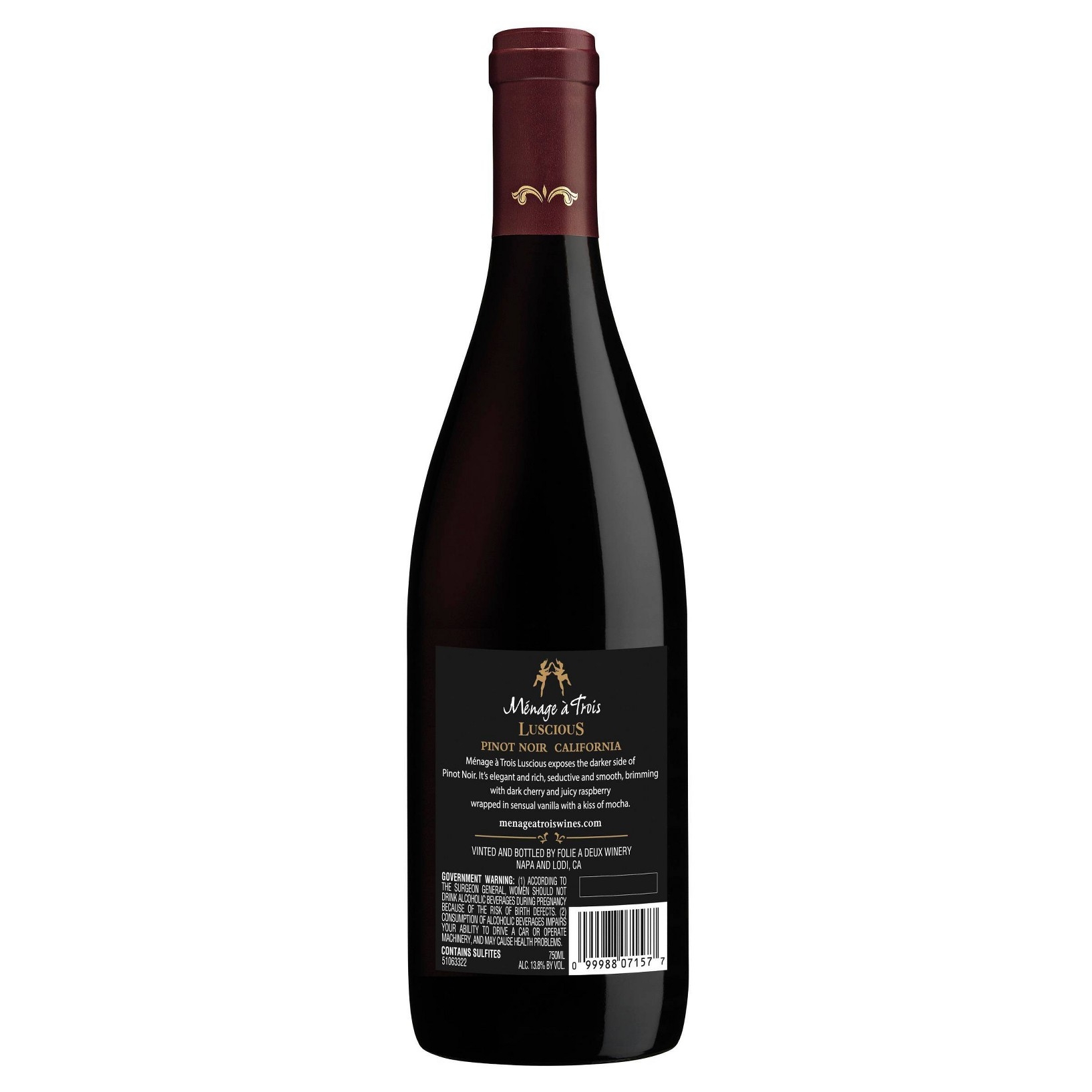 u0026bull;Dry red wine with black cherry and raspberry flavors with hints of vanilla and mochau003cbru003eu0026bull;Pinot Noir wine with sultry fragrance, voluptuous flavors and smooth finishu003cbru003eu0026bull;The 2017 vintage received 91 points in the Tasting Panel November 2018 issue; try the latest releaseu003cbru003eu0026bull;Pairs well with salmon, duck and roasted vegetables with herbsu003cbru003eu0026bull;California wine made with grapes sourced from cool climate vineyards in the Central Coast, North Coast and warmer inland Lodiu003cbru003eu0026bull;Aged in French and American oak to enhance the fruit flavors with smooth, rounded tanninsu003cbru003eu0026bull;One 750mL wine bottle of Menage a Trois Luscious Pinot Noir Red Wine, 13.9% ABV