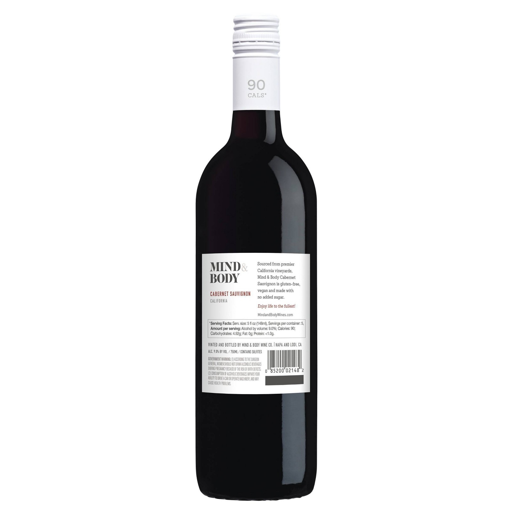 u0026bull;Notes of green olive, dried herbs and vanilla complement robust black cherry flavorsu003cbru003eu0026bull;Low-calorie, reduced alcohol wine with dark, enticing aromas of ripe blackberries and juicy raspberries and smooth, rounded finishu003cbru003eu0026bull;Earned 90 Points from Tasting Panel Magazineu003cbru003eu0026bull;Pair this vegan, gluten free red wine with grilled portobello mushrooms, smoky black beans and grilled eggplantu003cbru003eu0026bull;This red wine has 90 calories, 4.62 g carbs, 0 g fat and u003c1 g protein per 5 fl oz servingu003cbru003eu0026bull;Cold fermented and aged in stainless steel tanksu003cbru003eu0026bull;One 750mL wine bottle of Mind u0026 Body Cabernet Sauvignon Red Wine, 9% ABV