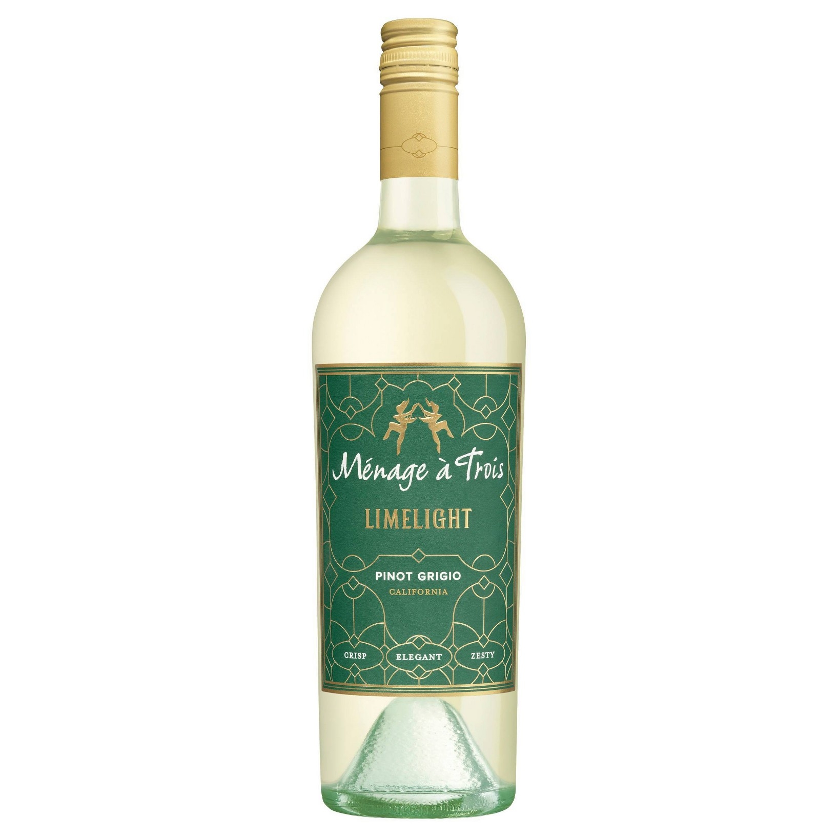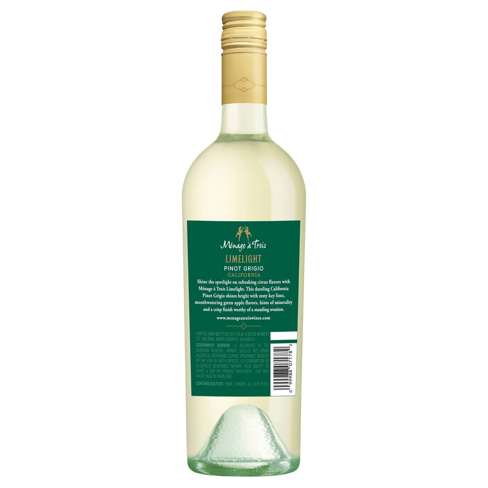 u0026bull;White wine with key lime and green apple flavorsu003cbru003eu0026bull;This Pinot Grigio wine has orange blossom aromas and a crisp, refreshing finishu003cbru003eu0026bull;The 2018 vintage received 90 Points from the Tasting Panel in April 2020; try the latest vintageu003cbru003eu0026bull;Serve this dry white wine with fresh green salad and light pastasu003cbru003eu0026bull;Sourced from grapes throughout Californiau003cbru003eu0026bull;Grapes are cold-fermented using a 100% non-malolactic wine making techniqueu003cbru003eu0026bull;One 750mL bottle of Menage a Trois Limelight Pinot Grigio White Wine, 13.2% ABV