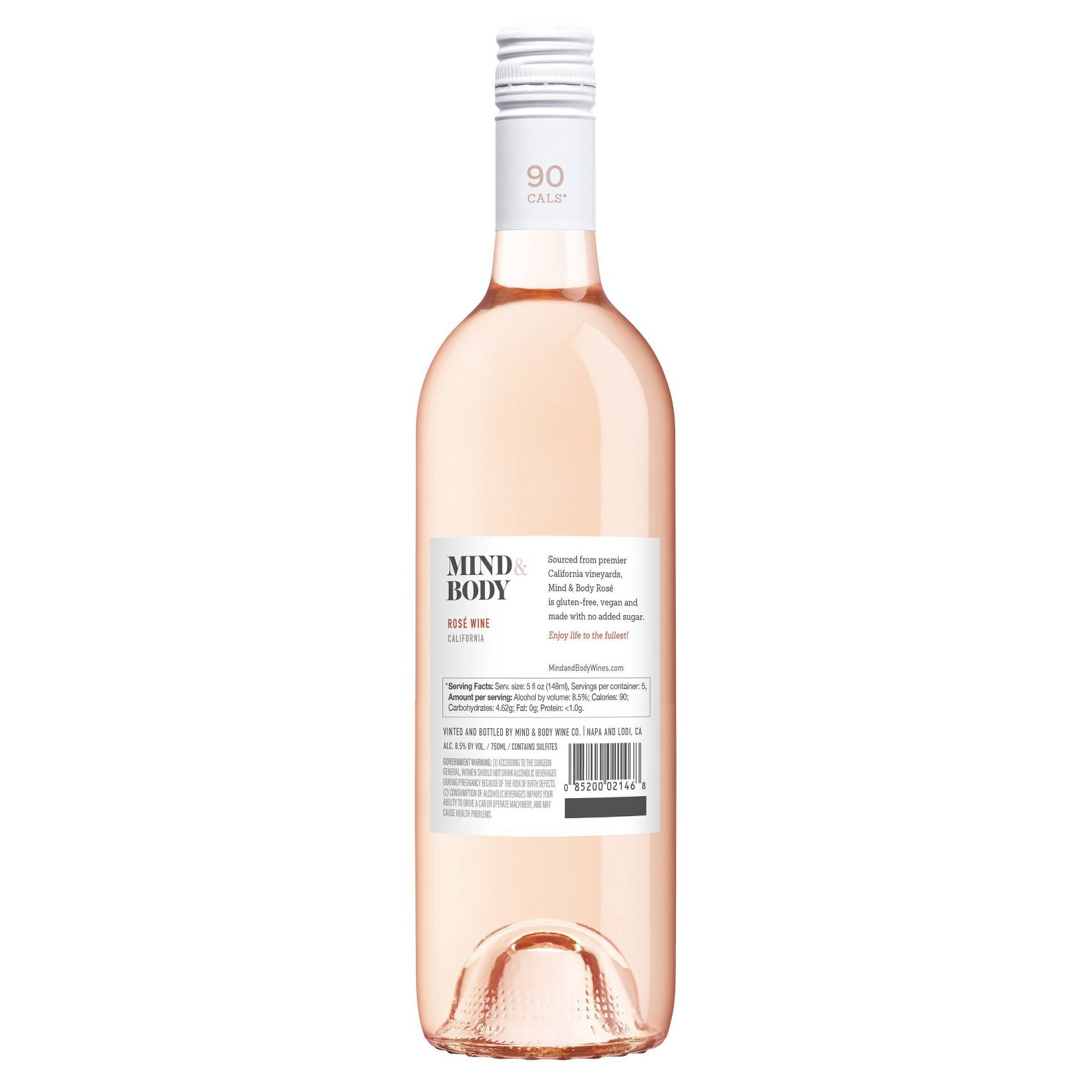u0026bull;Fresh, vibrant blush wine with flavors of fresh strawberriesu003cbru003eu0026bull;Aromatic low-calorie, low alcohol wine with a crisp, refreshing finishu003cbru003eu0026bull;Earned 90 Points from Tasting Panel Magazineu003cbru003eu0026bull;Pair this vegan, gluten free pink wine with melon and prosciutto salad, pickled vegetables and lemon garlic salmonu003cbru003eu0026bull;This wine has 90 calories, 4.62 g carbs, 0 g fat and u003c1 g protein per 5 fl oz servingu003cbru003eu0026bull;Cold fermented and aged in stainless steel tanksu003cbru003eu0026bull;One 750mL wine bottle of Mind u0026 Body Rose Wine, 8.5% ABV