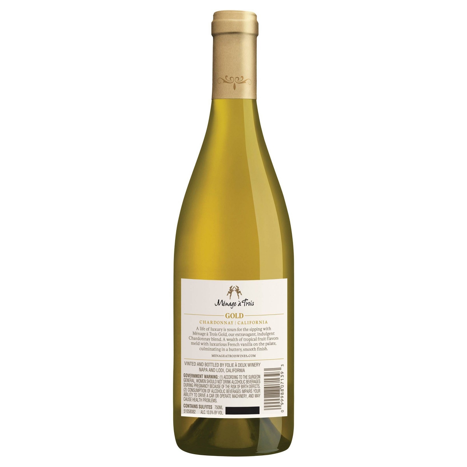 u0026bull;Chardonnay wine with tropical fruit flavors and luxurious French vanilla with hints of sweet spiceu003cbru003eu0026bull;Bottled wine with fragrances of creme brulee, honeyed pineapple and exotic floral notes with a smooth, buttery finish and full, round mouthfeelu003cbru003eu0026bull;The 2017 vintage received 94 Points from the Jerry Mead New World Wine Competition in 2019; try the latest releaseu003cbru003eu0026bull;Open a wine bottle of this California wine to serve with grilled chicken, crab, lobster and shrimpu003cbru003eu0026bull;Wine making process uses Chardonnay grapes from vineyards in California with a touch of Viognier and Verdelhou003cbru003eu0026bull;To enhance the wine, grapes are fermented with French and American oak, and then undergo malolactic fermentation for a lush, creamy mouthfeelu003cbru003eu0026bull;One 750mL bottle of Menage a Trois Gold Chardonnay White Wine, 13.5% ABV