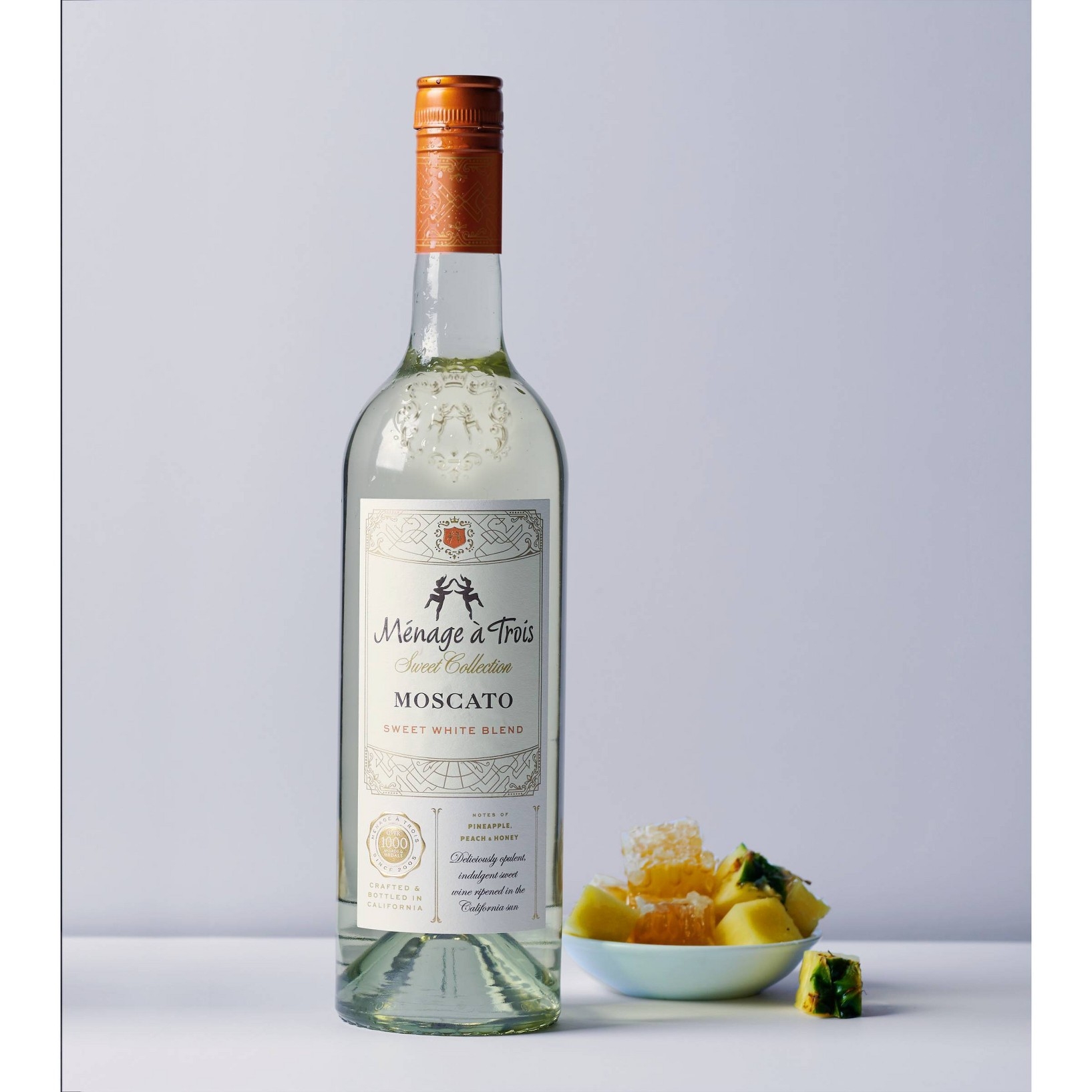 u0026bull;Decadent flavors of ripe peaches and bright pineapple drenched in honey and orange blossomsu003cbru003eu0026bull;Delicate carbonation and a lively finish lift the richness of the wine with aromas of orange zest, honeysuckle and crisp acidityu003cbru003eu0026bull;This sweet wine received 90 Points from the Tasting Panel in April/May 2021u003cbru003eu0026bull;Serve this California wine with cheese and vegetable plattersu003cbru003eu0026bull;Made with grapes grown in the warm California sunu003cbru003eu0026bull;Cold fermented at 50 degrees Fahrenheit to maintain the rich, sweet flavors and aromasu003cbru003eu0026bull;One 750mL bottle of Menage a Trois Sweet Collection Moscato Sweet White Wine, 9.5% ABV
