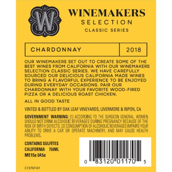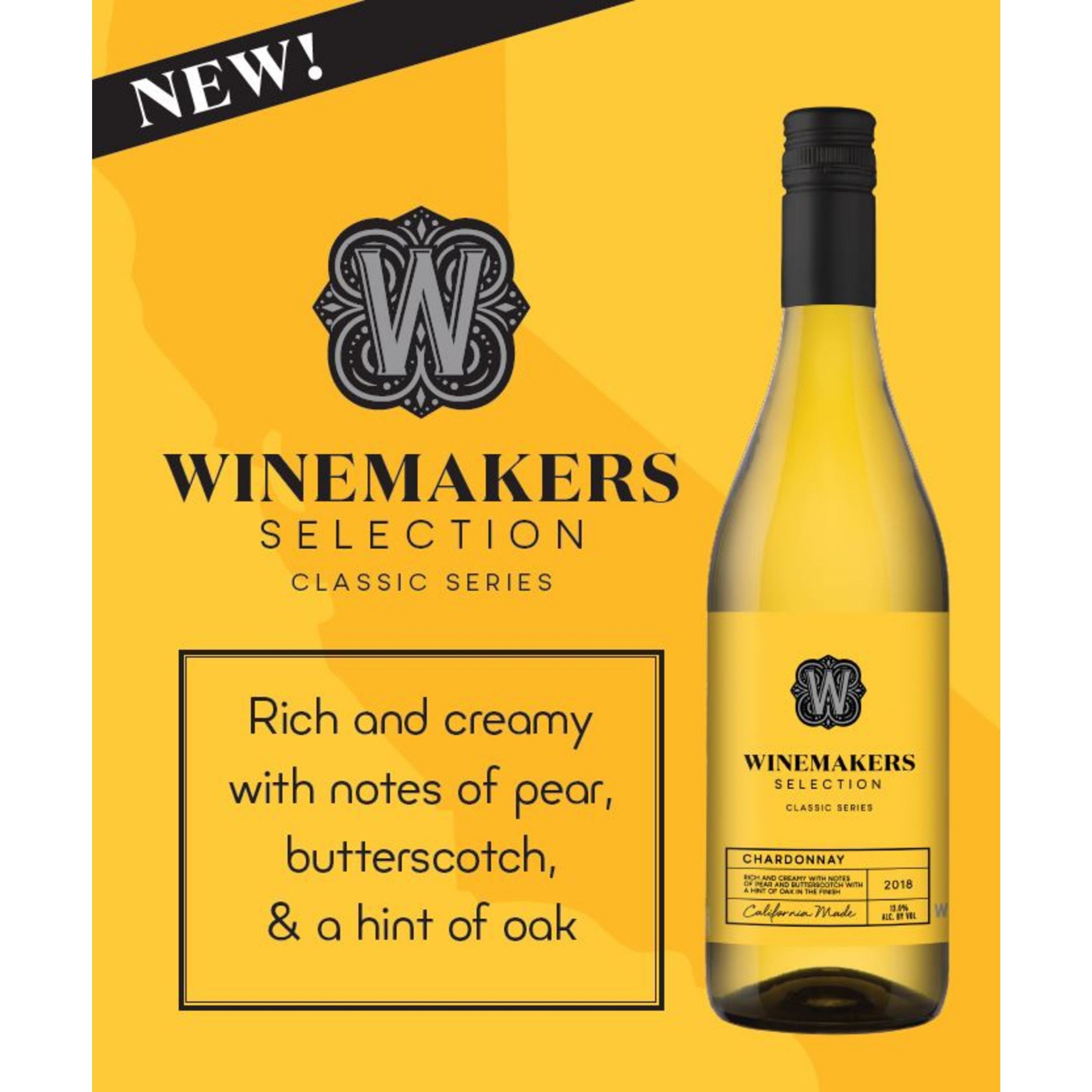 Our Winemakers set out to create some of the best wines from California with our Winemakers Selection Classic Series. We have carefully sourced our delicious California Made wines to bring a flavorful experience to be enjoyed during everyday occasions. This Chardonnay offers rich and creamy with notes of pear and butterscotch with a hint of oak in the finish, perfect to pair with a wood-fired pizza or roasted chicken. Our Winemakers set out to create some of the best wines from California with our Winemakers Selection Classic Series. We have carefully sourced our delicious California Made wines to bring a flavorful experience to be enjoyed during everyday occasions.