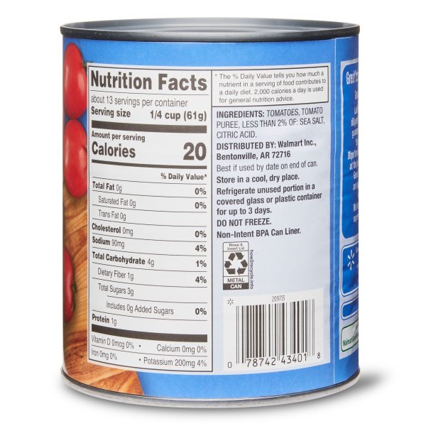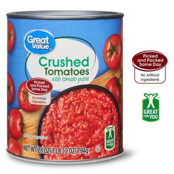 No well-stocked pantry is complete without Great Value Crushed Tomatoes with Tomato Puree. Ripe tomatoes are picked at the peak of freshness and canned within 5 hours to preserve their flavor. Our crushed tomatoes are perfect when you want to add a tasty kick to soups, sauces, casseroles, chilis, and more. Each serving only sets you back and with you can afford to indulge. The culinary possibilities are virtually endless when you choose Great Value Crushed Tomatoes with Tomato Puree.Great Value Canned Tomatoes. Grown by Family Farmers. Our story starts in California’s Central Valley, where local family farmers work diligently to bring the wholesome goodness of Great Value canned tomatoes to your home. Ripe tomatoes are picked and canned at the peak of freshness within 5 hours of harvest and we use only hot water and steam to peel the tomatoes to preserve freshness and flavor. Great Value canned tomatoes are available in many different varieties and styles. We hope you enjoy this eating experience with your families for years to come. Great Value products provide families with affordable, high quality grocery and household consumable options. With our wide range of product categories spanning grocery and household consumables, we offer you a variety of products for your family’s needs. Our products are conveniently available online and in Walmart stores nationwide, allowing you to stock up and save money at the same time.