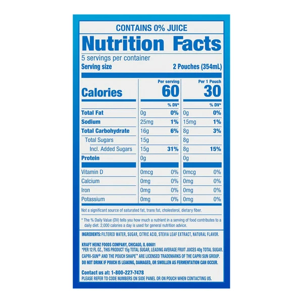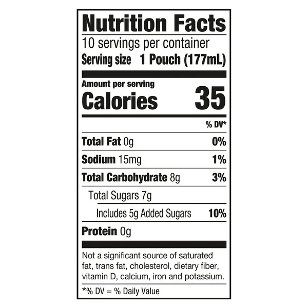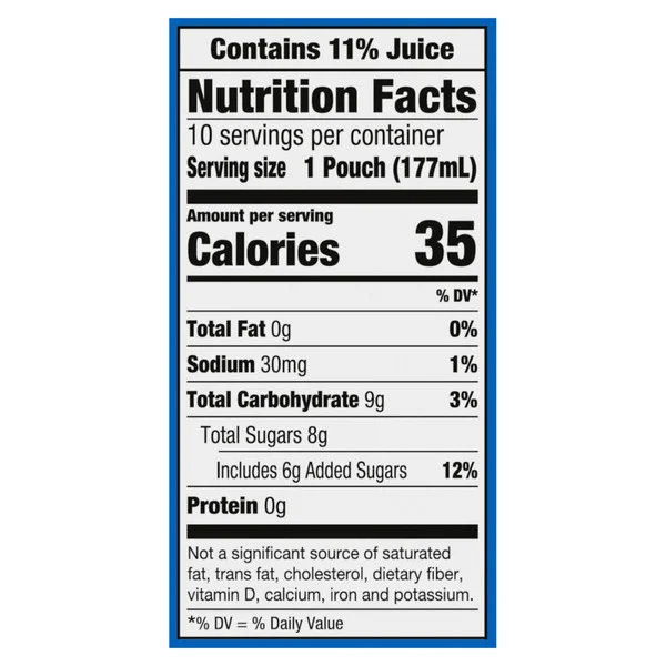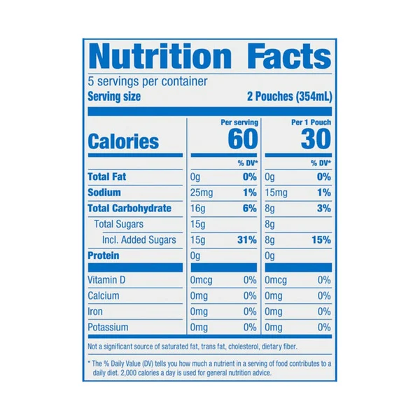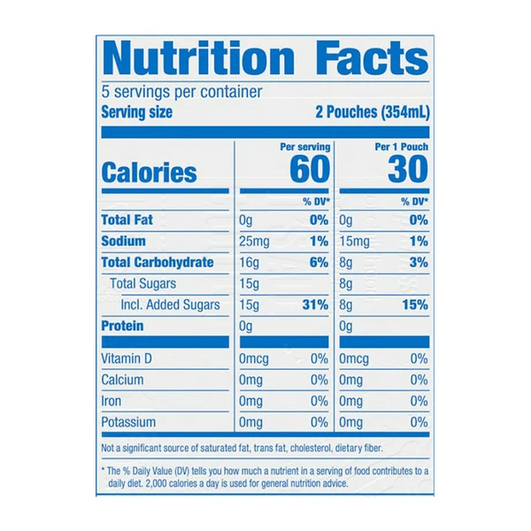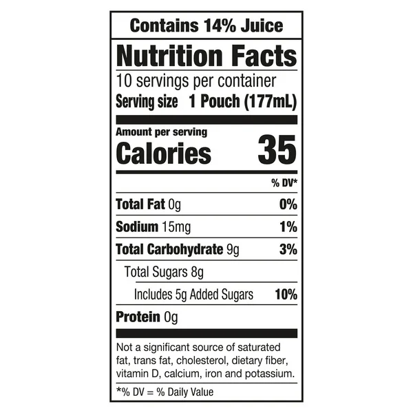 ?Each pouch contains 30% less sugar than leading regular juice drinks (This product 13 g total sugar; leading regular juice drinks 20 g total sugar per 6 fl. oz. serving)