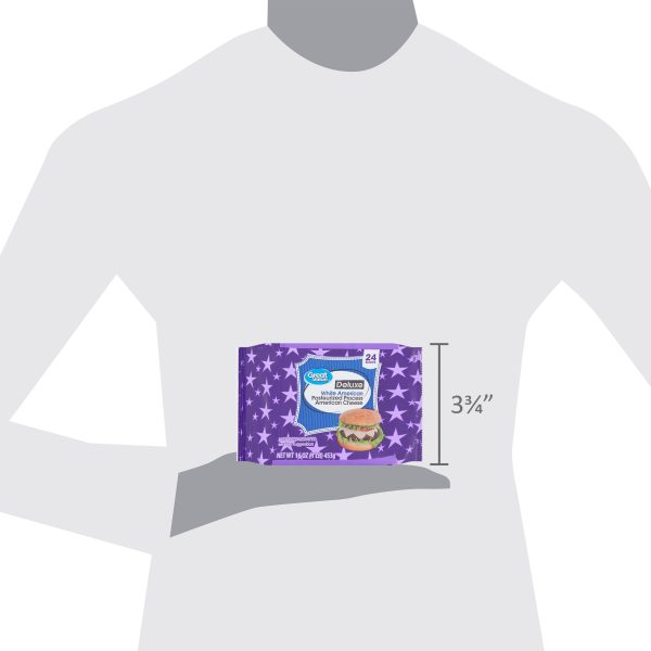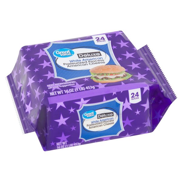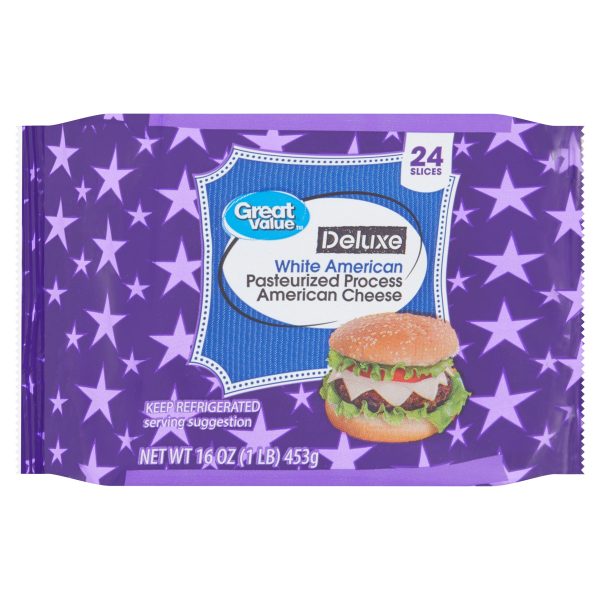 Get ready for your next barbecue or tailgate with Great Value Deluxe White American Pasteurized Process Cheese. Cut to perfection, these cheese slices are ready to be layered onto hamburgers, veggie burgers, or cheesesteak sandwiches. Try them out in some grilled cheese sandwiches that your kids will adore. Make tasty meals quick and easy with Great Value Deluxe White American Pasteurized Process Cheese.