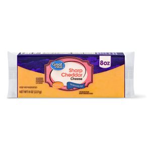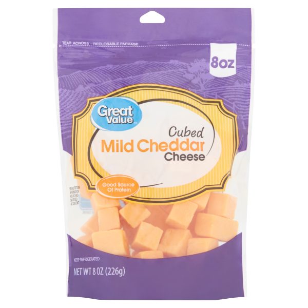 Create tasty meals and snacks with Great Value Mild Cheddar Cheese, 8 oz. Enjoy creamy, rich flavor in a form that’s fun to eat. Smooth, semi-soft and sumptuous, these cheerful orange mini blocks look good on cheese plates and are an ideal size for snacks. The cheddar cheese cubes also melt nicely atop hamburgers and blend beautifully into casseroles, sauces and mac and cheese. Include them as a pleasant surprise in lunchboxes or pair them with crackers at a party. Great Value cheddar cheese is also versatile and makes tasty snacks for your next gathering. It is a source of protein and is high in calcium.