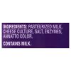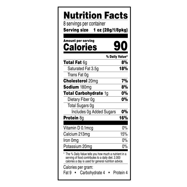 This product contains 6g total fat. Regular cheddar cheese contains 9g total fat per serving.