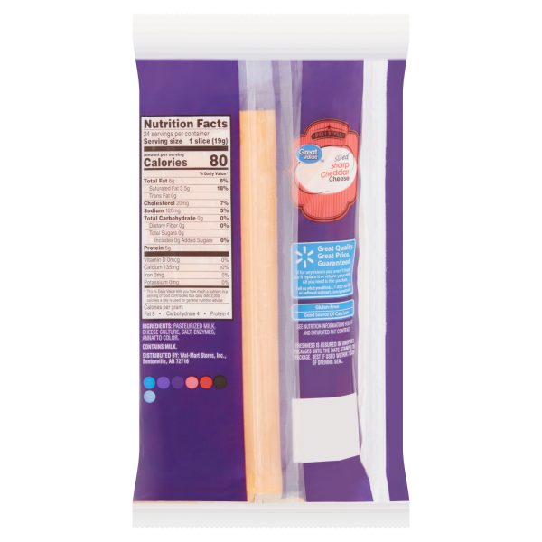 Great Value Deli Style Sliced Sharp Cheddar Cheese is for dairy lovers who enjoy intense, creamy, rich flavor. This 16-ounce package comes with 24 deli-style slices of sharp Cheddar cheese, which are great for melty grilled cheese sandwiches, juicy cheeseburgers, or traditional cheese-and-cracker appetizers. Try melting these slices over veggies or nachos, bake inside lasagna, add to hot hoagies, or enjoy a few yummy slices as a snack with some juicy red or green grapes. Add bold flavor to your next epic meal with Great Value Deli Style Sliced Sharp Cheddar Cheese.