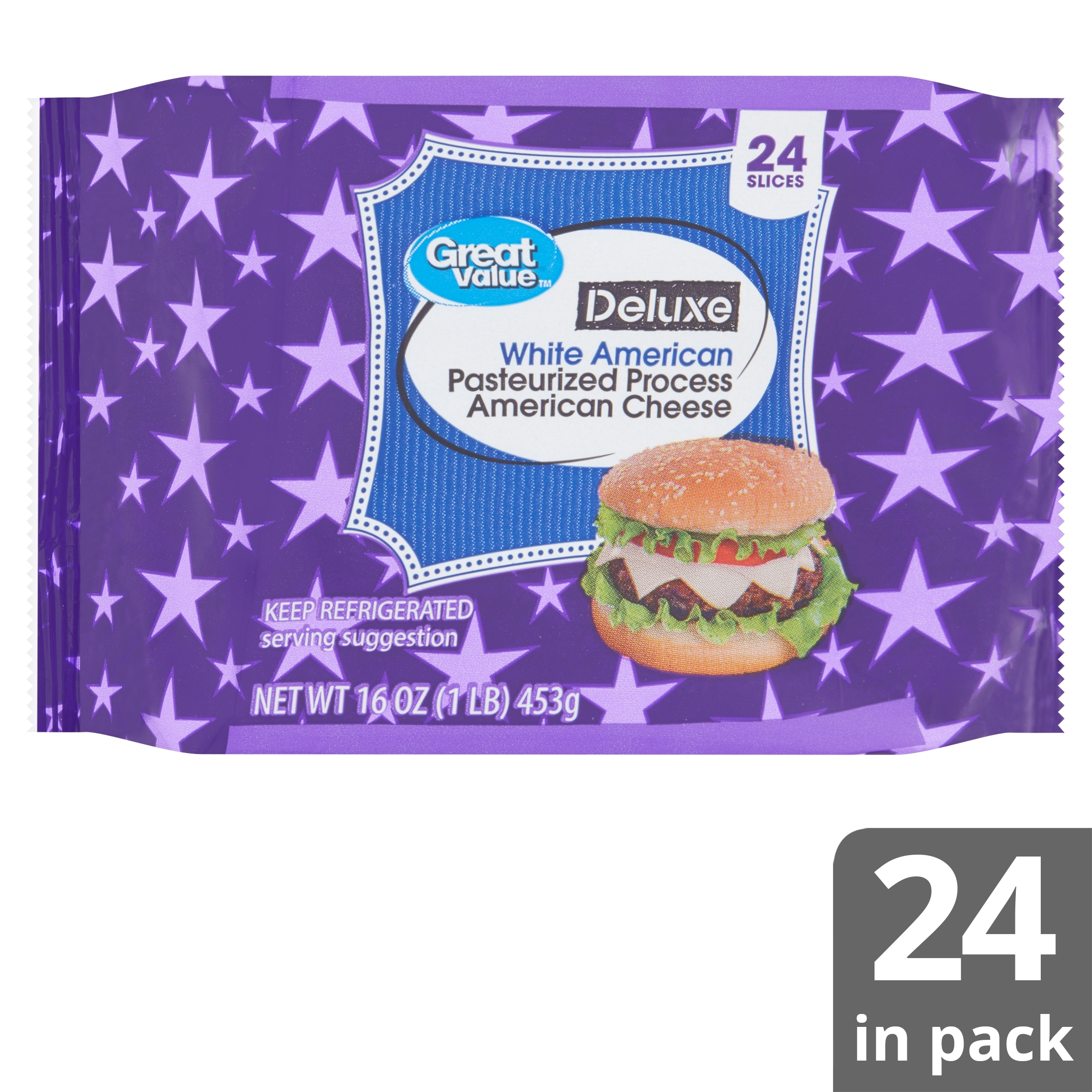 Get ready for your next barbecue or tailgate with Great Value Deluxe White American Pasteurized Process Cheese. Cut to perfection, these cheese slices are ready to be layered onto hamburgers, veggie burgers, or cheesesteak sandwiches. Try them out in some grilled cheese sandwiches that your kids will adore. Make tasty meals quick and easy with Great Value Deluxe White American Pasteurized Process Cheese.