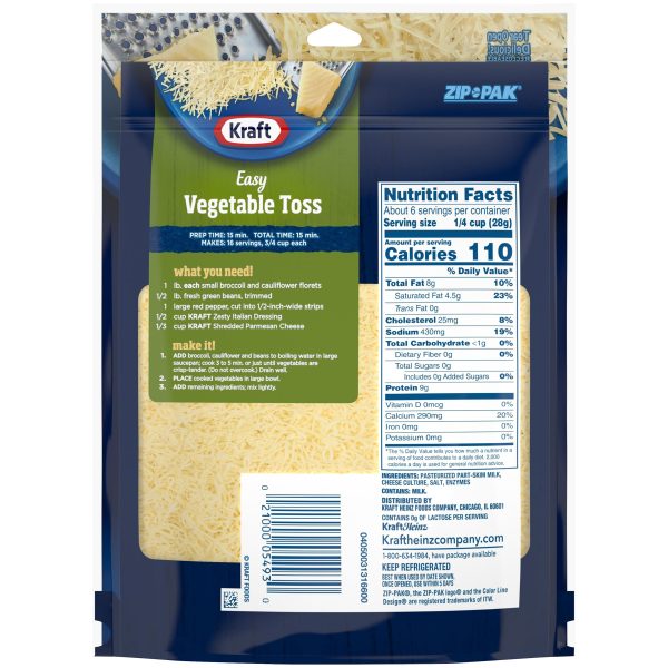 Mealtime can be hard, especially when it comes to making something everyone agrees on. Use Kraft Finely Shredded Natural Parmesan Shredded Cheese to make something everyone will love, so you can spend time focused on each other and not worried about making everyone happy. Kraft Finely Shredded Natural Parmesan Shredded Cheese adds a delicious punch of flavor to your Italian-inspired dinners. This cheese features a rich taste that is a great addition to your next pizza or pasta recipe. Pre-shredded for convenience, this cheese is easy to sprinkle over your family’s favorite foods and melts beautifully in the oven. Kraft cheeses are made with real milk for full flavor and consistent quality. Use this cheese on pastas, pizzas, salads, soups and more. Each 6 ounce bag is resealable to help lock in flavor.