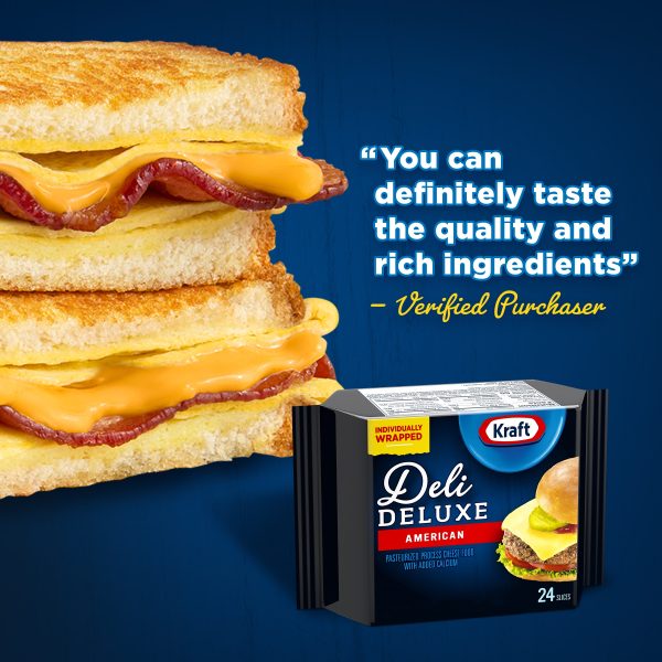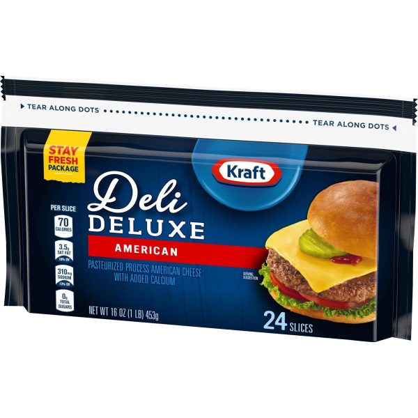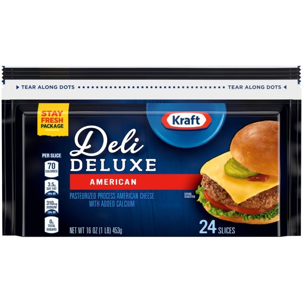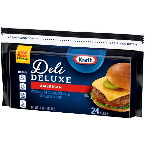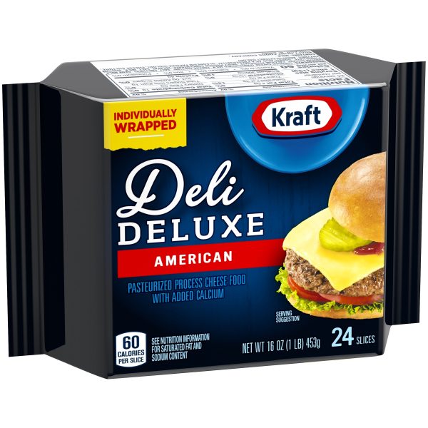 u0026bull;One 24 ct. pack of Kraft Deli Deluxe American Cheese Slicesu003cbru003eu0026bull;Kraft Deli Deluxe American Cheese Slices elevate your favorite mealsu003cbru003eu0026bull;Yellow American cheese is slightly tangy and creamyu003cbru003eu0026bull;Sliced cheese cuts prep time and melts easily over hot foodsu003cbru003eu0026bull;Made with milk for quality and consistencyu003cbru003eu0026bull;Use on sandwiches, burgers, grilled cheese and moreu003cbru003eu0026bull;Resealable pack helps lock in flavoru003cbru003eu0026bull;SNAP u0026 EBT eligible food item