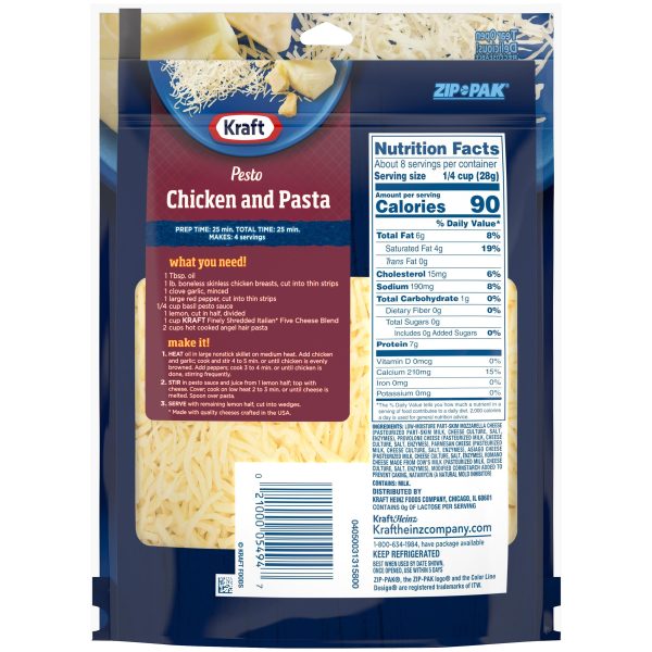 Mealtime can be hard, especially when it comes to making something everyone agrees on. Use Kraft Natural Italian Five Cheese Blend Shredded Cheese to make something everyone will love, so you can spend time focused on each other and not worried about making everyone happy. This shredded cheese includes low-moisture and part-skim Mozzarella, Provolone, Parmesan, Asiago and Romano cheeses and adds a delicious punch of flavor to your Italian-inspired dinners. This cheese features a rich taste that is a great addition to your next pizza or pasta recipe. Pre-shredded for convenience, this Italian cheese blend is easy to sprinkle over your family’s favorite foods and melts beautifully in the oven. Kraft cheeses are made with real milk for full flavor and consistent quality. Use this cheese on pastas, pizzas, salads, soups and more. Each 8 ounce bag of shredded cheese is resealable to help lock in flavor.