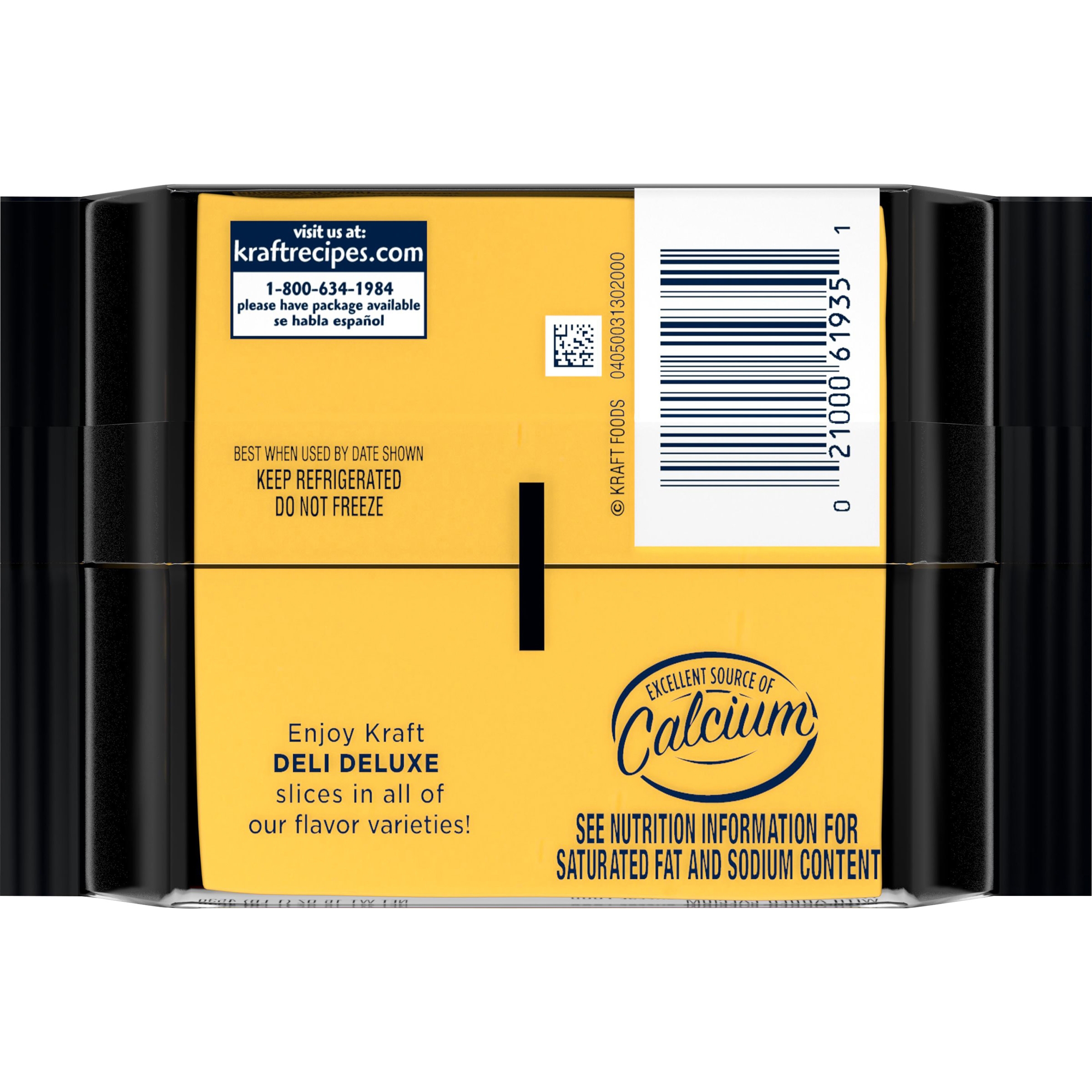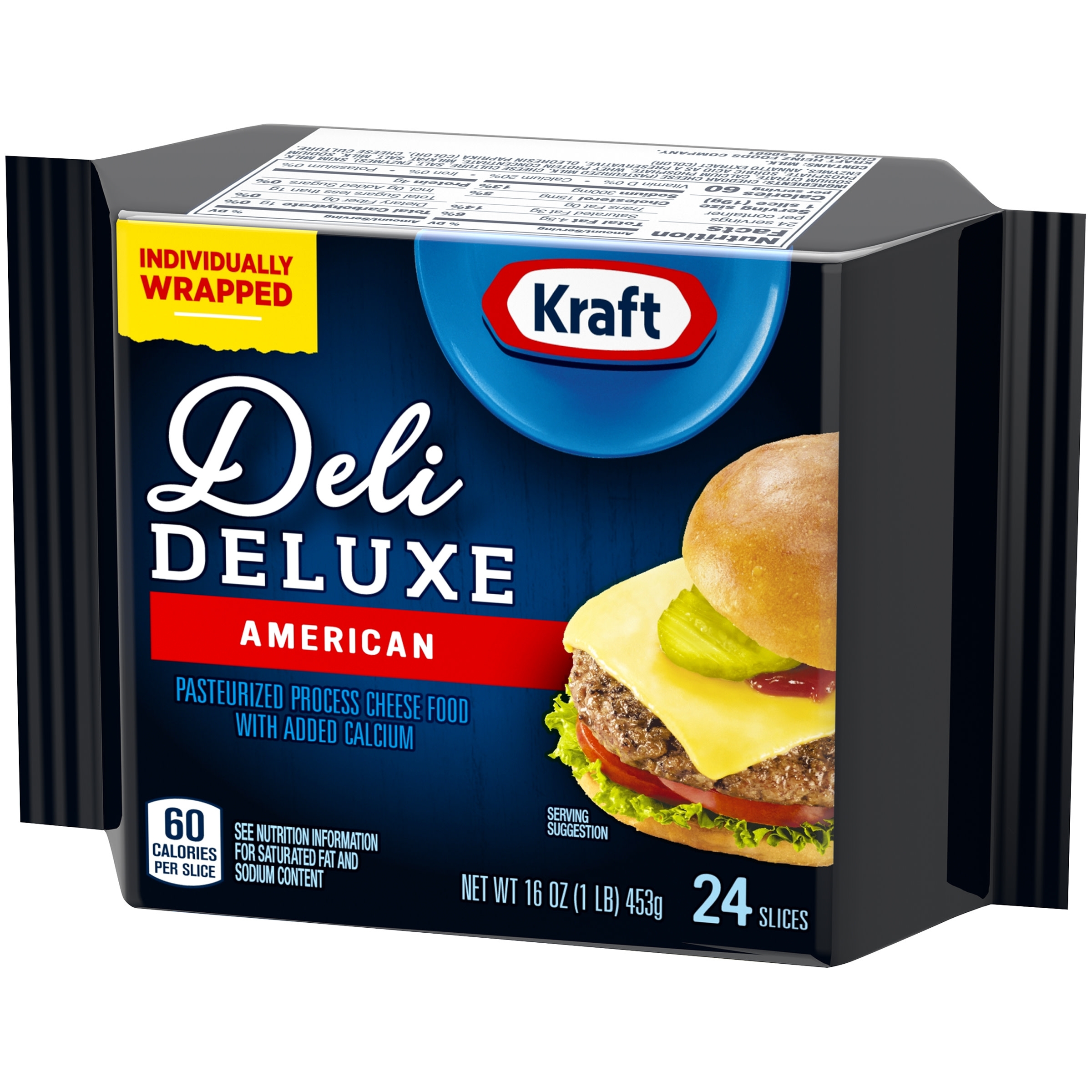 Kraft Deli Deluxe American Cheese Slices are creamy, rich and full of flavor. This sliced American cheese features a mild, slightly tangy flavor and smooth texture that goes well with meat and vegetable dishes. Pre-sliced for your convenience, this deli style American cheese is perfect for slipping into sandwiches or snacking on straight from the package. Kraft Deli Deluxe cheeses are made with quality ingredients like pasteurized milk for full flavor and consistency. These slices contain 20% daily value of calcium per serving, see nutrition information for saturated fat and sodium content. Put one of these creamy American cheese slices on any sandwich or burger for the perfect melt, or add them to a cheese sauce to elevate your classic mac and cheese recipe. For optimum flavor, keep this 16 ounce package of 24 individually wrapped American cheese slices in the fridge until use.