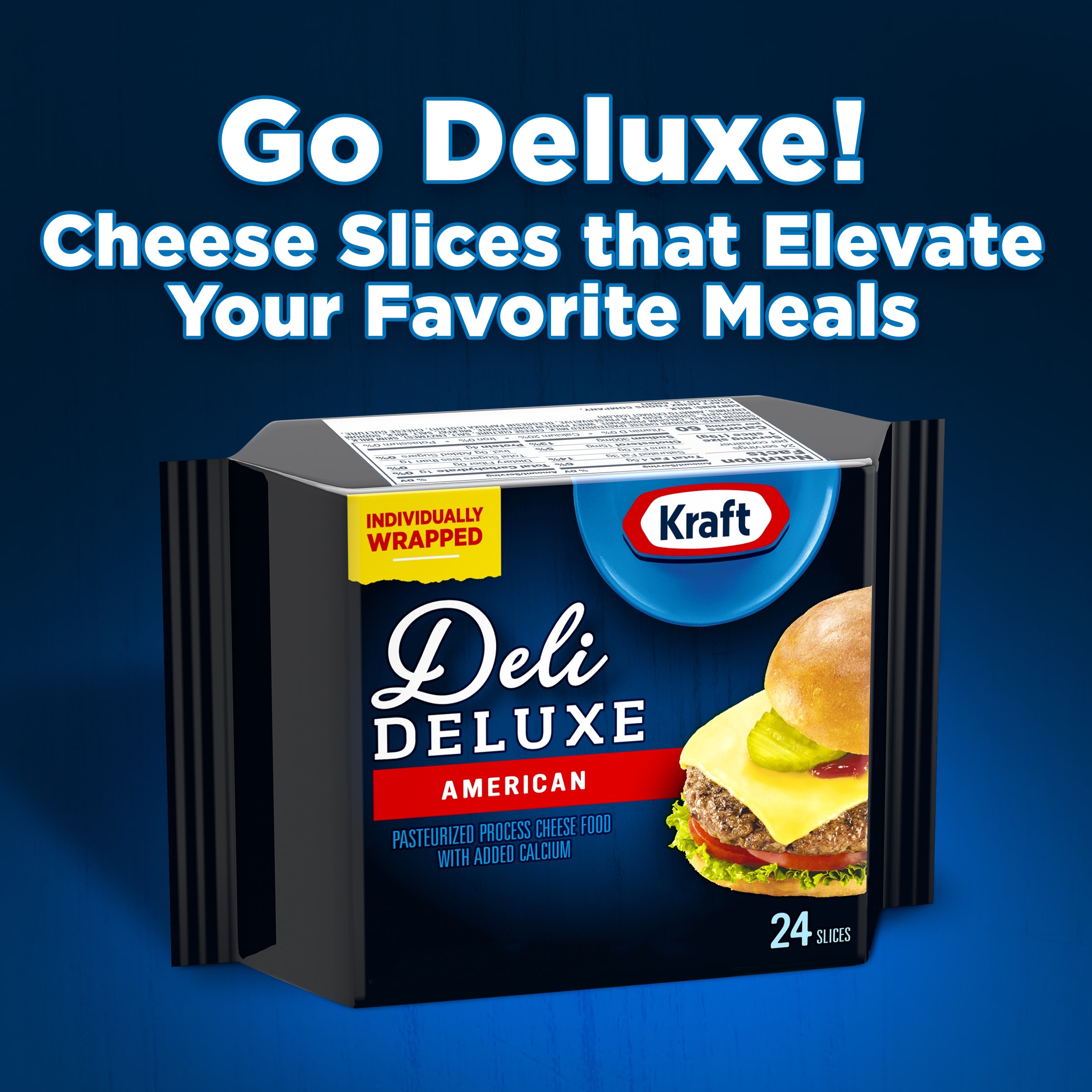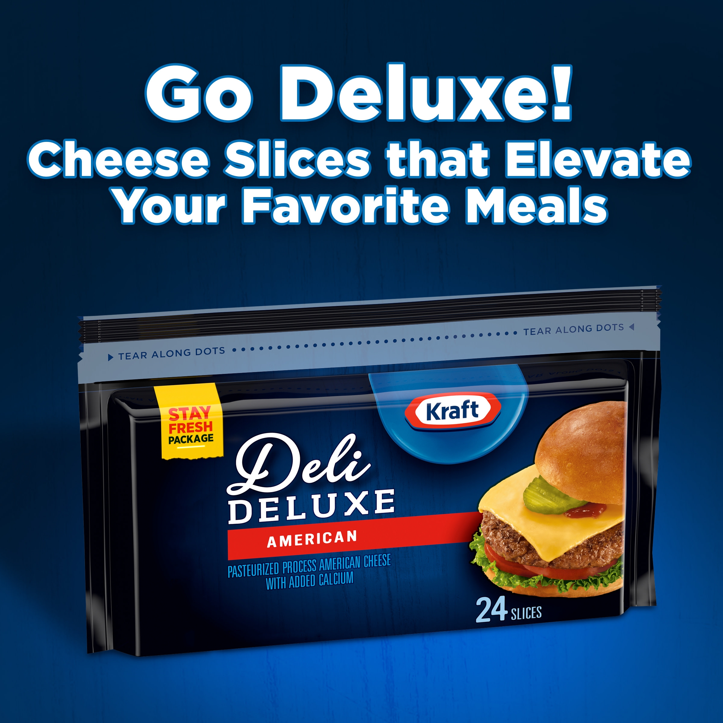 u0026bull;One 24 ct. pack of Kraft Deli Deluxe American Cheese Slicesu003cbru003eu0026bull;Kraft Deli Deluxe American Cheese Slices elevate your favorite mealsu003cbru003eu0026bull;Yellow American cheese is slightly tangy and creamyu003cbru003eu0026bull;Sliced cheese cuts prep time and melts easily over hot foodsu003cbru003eu0026bull;Made with milk for quality and consistencyu003cbru003eu0026bull;Use on sandwiches, burgers, grilled cheese and moreu003cbru003eu0026bull;Resealable pack helps lock in flavoru003cbru003eu0026bull;SNAP u0026 EBT eligible food item