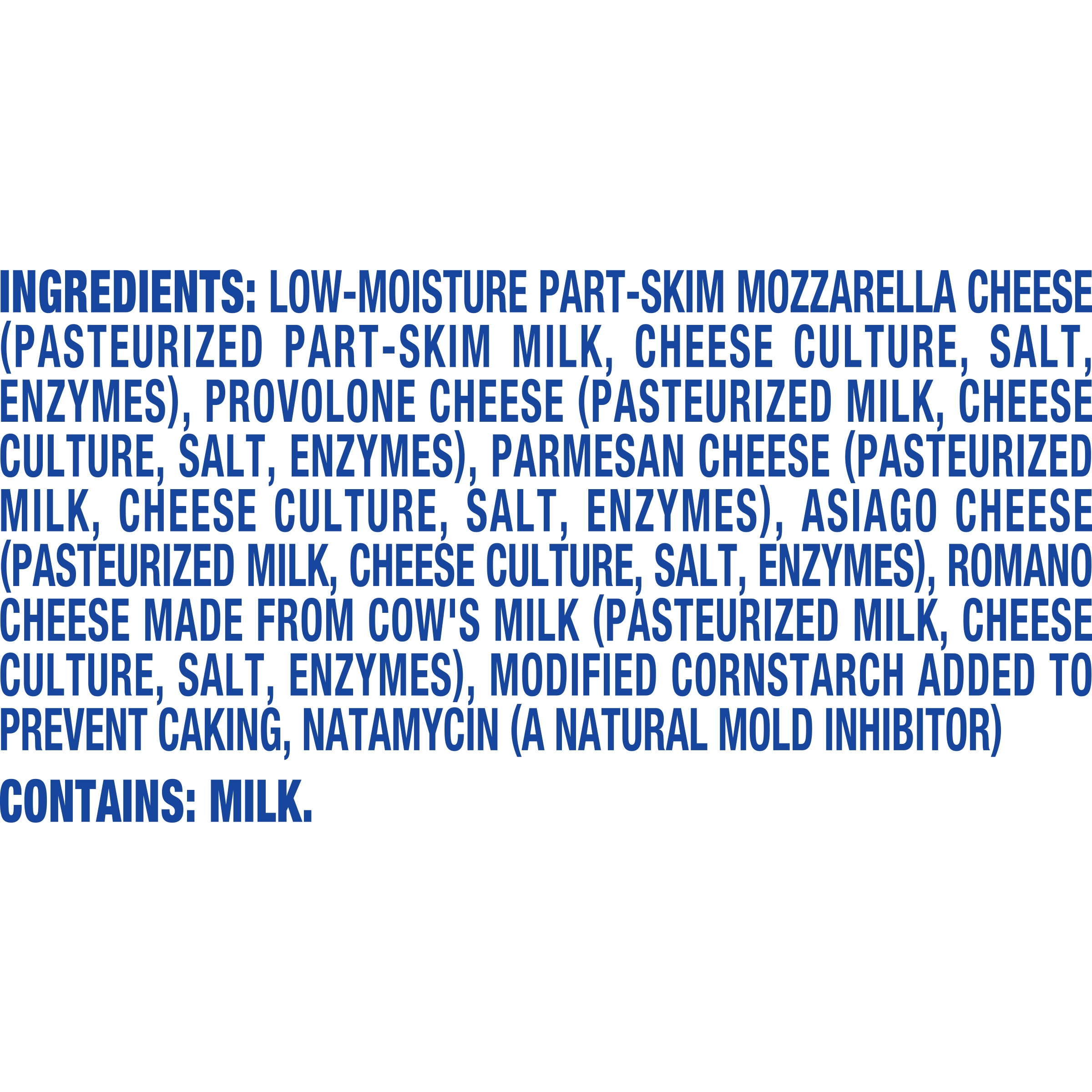 Mealtime can be hard, especially when it comes to making something everyone agrees on. Use Kraft Natural Italian Five Cheese Blend Shredded Cheese to make something everyone will love, so you can spend time focused on each other and not worried about making everyone happy. This shredded cheese includes low-moisture and part-skim Mozzarella, Provolone, Parmesan, Asiago and Romano cheeses and adds a delicious punch of flavor to your Italian-inspired dinners. This cheese features a rich taste that is a great addition to your next pizza or pasta recipe. Pre-shredded for convenience, this Italian cheese blend is easy to sprinkle over your family’s favorite foods and melts beautifully in the oven. Kraft cheeses are made with real milk for full flavor and consistent quality. Use this cheese on pastas, pizzas, salads, soups and more. Each 8 ounce bag of shredded cheese is resealable to help lock in flavor.