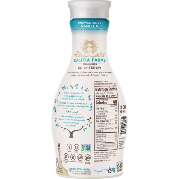 u0026bull;SMOOTH u0026 CREAMY: Unsweetened Vanilla Almondmilk is smooth and creamy with 0g of sugar per serving. It’s your favorite almond milk beautifully blended with the seductive flavor of vanilla.u003cbru003eu0026bull;GREAT FOR BAKING: Unsweetened Vanilla Almondmilk is perfect for baking and making your favorite dessert recipes. Pour over cereal, blend into smoothies, add to coffee, or drink it straight from a glass. This plant milk is deliciously versatile.u003cbru003eu0026bull;EXCELLENT SOURCE OF CALCIUM: Unsweetened Vanilla Almondmilk is an excellent source of calcium. Plus it’s only 40 calories and 0g of sugar per serving.u003cbru003eu0026bull;SIMPLE PLANT-BASED INGREDIENTS: Califia Farms plant milks are made with plant-based, dairy-free ingredients that are Non-GMO Certified, Kosher, vegan, and free from carrageenan.u003cbru003eu0026bull;DELICIOUSLY UNSWEETENED: Vanilla almond milk that’s creamy and delightfully drinkable, just without the sugar. Zero grams of sugar per serving to be exact. It’s plant-based, dairy-free, and totally delicious. Pure and simple.