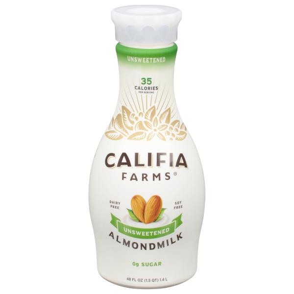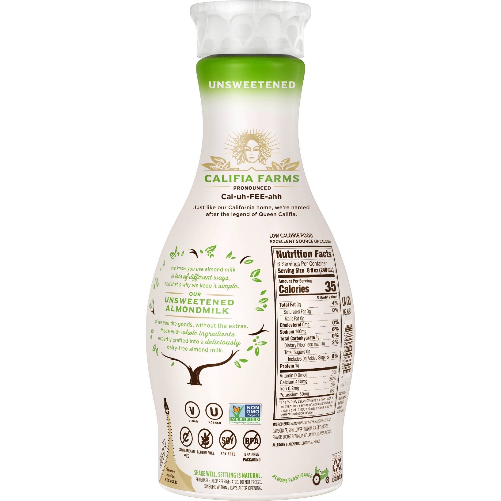 u0026bull;SMOOTH u0026 CREAMY: Unsweetened Almondmilk is smooth and creamy with 0g of sugar per serving, perfect for all your plant milk needs.u003cbru003eu0026bull;USE FOR COOKING u0026 BAKING: Unsweetened Almondmilk is perfect for all culinary applications from savory recipes to baked treats. Pour over cereal, blend into smoothies, add to coffee, or drink it straight from a glass. This plant milk is deliciously versatile.u003cbru003eu0026bull;EXCELLENT SOURCE OF CALCIUM: Unsweetened Almondmilk is an excellent source of calcium. Plus it’s only 35 calories and 0g of sugar per serving.u003cbru003eu0026bull;SIMPLE PLANT-BASED INGREDIENTS: Califia Farms plant milks are made with plant-based, dairy-free ingredients that are Non-GMO Certified, Kosher, vegan, and free from carrageenan.u003cbru003eu0026bull;DELICIOUSLY UNSWEETENED: Almond milk that’s creamy and delightfully drinkable, just without the sugar. Zero grams of sugar per serving to be exact. It’s plant-based, dairy-free, and totally delicious. Pure and simple.
