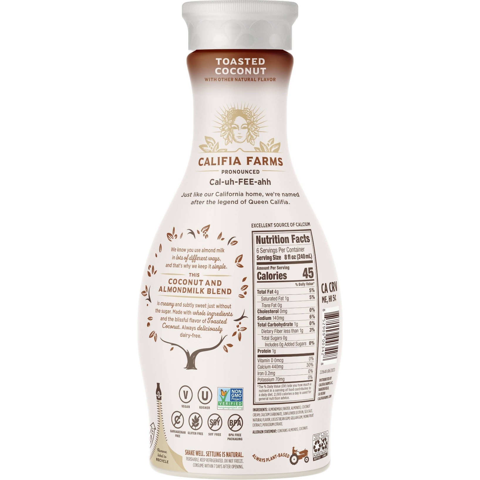 u0026bull;DELICIOUSLY DRINKABLE: Toasted Coconut Almondmilk is a smooth and creamy blend of almond milk and coconut cream with the blissful flavor of toasted coconut. It’s sugar-free*, but still totally delicious. Always plant-based, always dairy-free. *not a low calorie foodu003cbru003eu0026bull;EXCELLENT SOURCE OF CALCIUM: Toasted Coconut Almondmilk is an excellent source of calcium. Plus it’s only 45 calories and 0g of sugar* per serving. *not a low calorie foodu003cbru003eu0026bull;SIMPLE PLANT-BASED INGREDIENTS: Califia Farms plant milks are made with plant-based, dairy-free ingredients that are Non-GMO Certified, Kosher, vegan, and free from carrageenan.u003cbru003eu0026bull;GREAT FOR BAKING: Toasted Coconut Almondmilk is perfect for baking and making your favorite dessert recipes. Pour over cereal, blend into smoothies, add to coffee, or drink it straight from a glass. This plant milk is deliciously versatile.