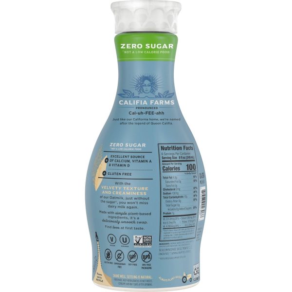 u0026bull;CREAMY u0026 SMOOTH: Oat milk is known to be the creamiest plant milk on the planet, and this Zero Sugar* Oatmilk is no exception. Rich, creamy, and with 0g of sugar* per serving. *not a low calorie foodu003cbru003eu0026bull;ZERO GRAMS OF SUGAR: All the rich creaminess you love oat milk for, just without the sugar*. Califia Farms Zero Sugar* Oatmilk has exactly that, 0g of sugar* per serving. *not a low calorie food.u003cbru003eu0026bull;USE FOR COOKING u0026 BAKING: Perfect for all culinary applications from savory dishes to sweet baked treats. This is a good plant-based milk to swap into any recipe you want to make dairy-free.u003cbru003eu0026bull;SIMPLE PLANT-BASED INGREDIENTS: Califia Farms oat milks are made with plant-based, dairy-free ingredients that are Non-GMO Certified, Glyphosate free, Kosher, vegan, and free from carrageenan. Made with gluten-free oats.u003cbru003eu0026bull;GLUTEN FREE OATS: Califia Farms oat milks are made with gluten-free oats. They’re the perfect ultra-creamy plant-based milks for those with gluten sensitivities.