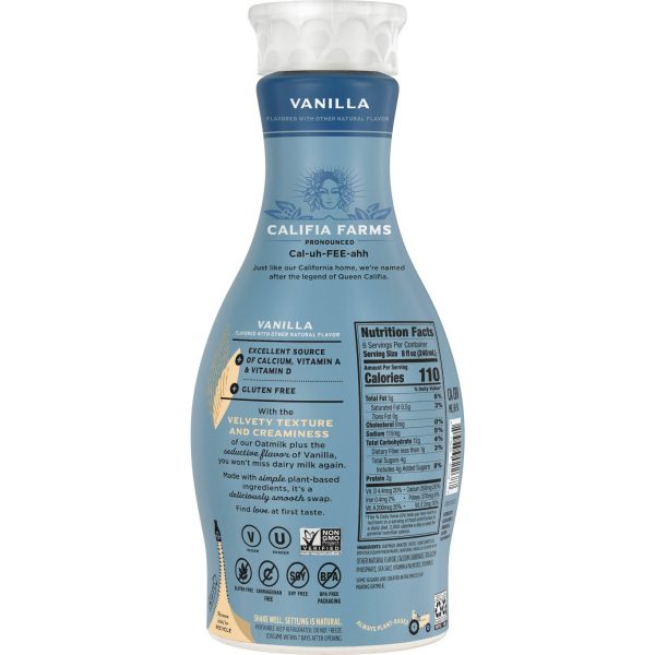 u0026bull;CREAMY u0026 SMOOTH: The creamiest, dreamiest oat milk beautifully blended with the subtly sweet flavor of vanilla. With a smooth texture and delicate creaminess that could only be made better by the flavor of vanilla.u003cbru003eu0026bull;EASY SWAP FROM DAIRY: Vanilla Oatmilk makes a smooth swap from dairy with its rich and creamy texture, subtly sweet vanilla flavor, and incredible versatility. With this oat milk in your life, you won’t miss dairy milk again.u003cbru003eu0026bull;EXCELLENT SOURCE OF CALCIUM: Vanilla Oatmilk is an excellent source of calcium, vitamin A and vitamin D. Plus it’s made with gluten-free oats.u003cbru003eu0026bull;SIMPLE PLANT-BASED INGREDIENTS: Califia Farms oat milks are made with plant-based, dairy-free ingredients that are Non-GMO Certified, Glyphosate free, Kosher, vegan, and free from carrageenan. Made with gluten-free oats.u003cbru003eu0026bull;USE FOR BAKING: Great for all your baking needs, Vanilla Oatmilk is the perfect plant-based milk for baking, dessert recipes, and making ice cream. Pour over cereal, blend into smoothies, add to coffee, and sip straight from the glass.