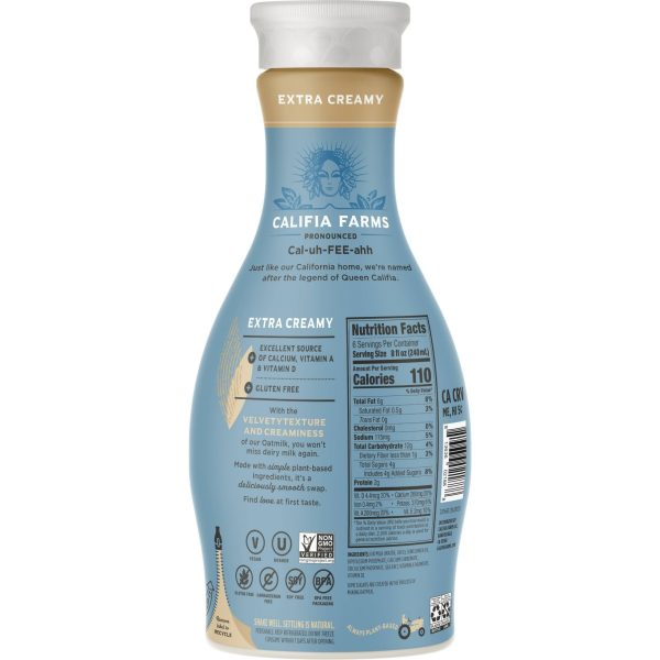 u0026bull;CREAMY u0026 SMOOTH: Oat milk is known to be the creamiest plant milk on the planet, and our Extra Creamy Oatmilk proves it. Rich and smooth, with a creamy, neutral taste. It’s the perfect dairy-free base for all of your food and drink creations.u003cbru003eu0026bull;EASY SWAP FROM DAIRY: Extra Creamy Oatmilk makes a smooth swap from dairy with its rich and creamy texture, neutral flavor, and incredible versatility. With this oat milk in your life, you won’t miss dairy milk again.u003cbru003eu0026bull;EXCELLENT SOURCE OF CALCIUM: Extra Creamy Oatmilk is an excellent source of calcium, vitamin A and vitamin D. Plus it’s made with gluten-free oats.u003cbru003eu0026bull;SIMPLE PLANT-BASED INGREDIENTS: Califia Farms oat milks are made with plant-based, dairy-free ingredients that are Non-GMO Certified, Glyphosate free, Kosher, vegan, and free from carrageenan. Made with gluten-free oats.u003cbru003eu0026bull;USE FOR COOKING u0026 BAKING: Extra Creamy Oatmilk is the perfect plant-based milk for cooking, baking, everything-making! Plus it’s delicious in all the obvious ways: pour over cereal, add to coffee, blend into smoothies, or sip straight from the glass.