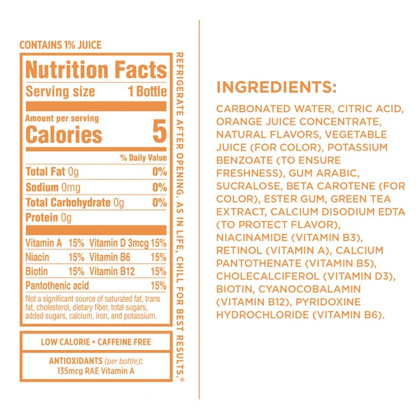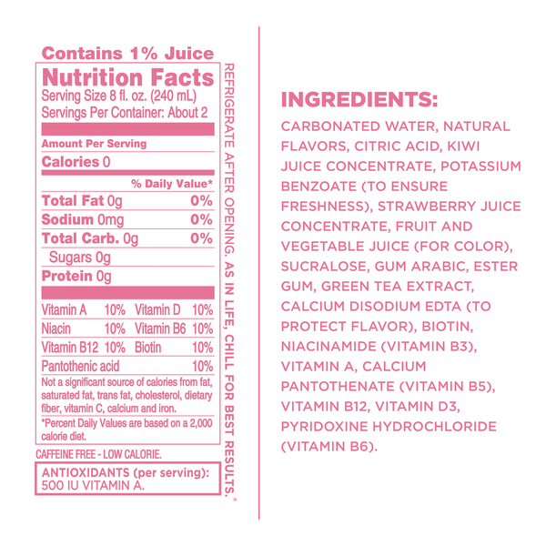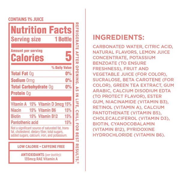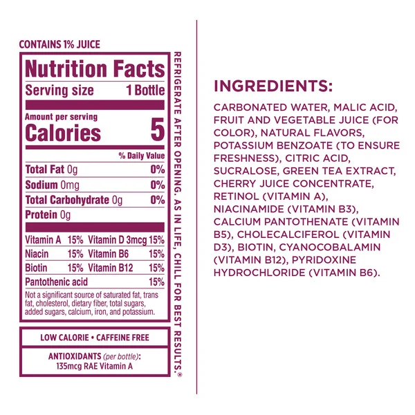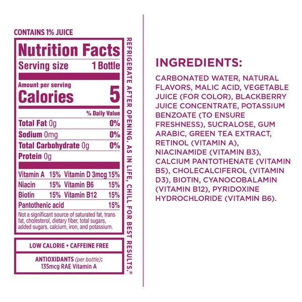 u0026bull; Now with colors and flavors from natural sourcesu003cbru003eu0026bull; Always bursting with real fruit flavor u003cbru003eu0026bull; Zero Sugar and Zero Caloriesu003cbru003eu0026bull; Each bottle has Antioxidents and Vitaminsu003cbru003eu0026bull; Contains 1% Juice