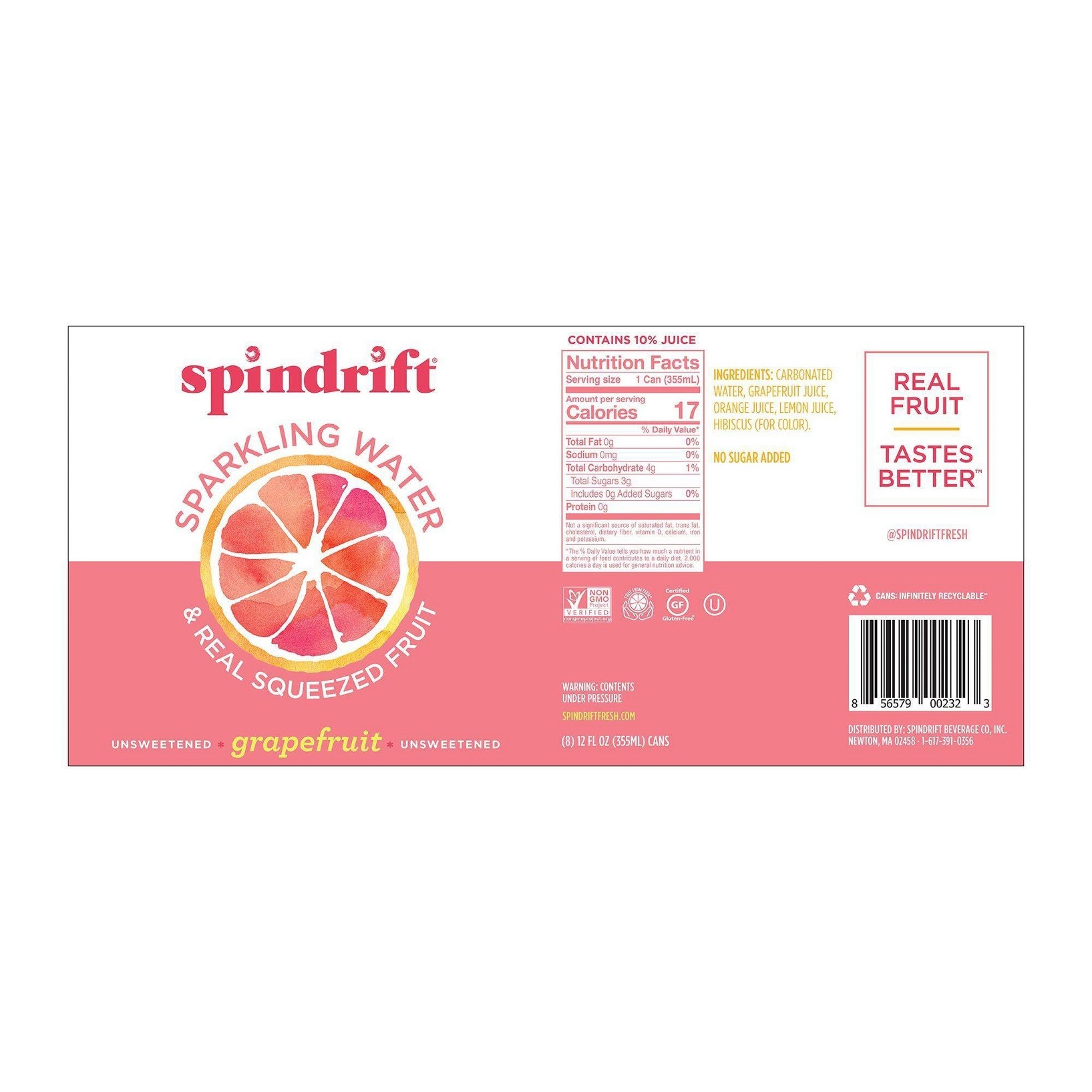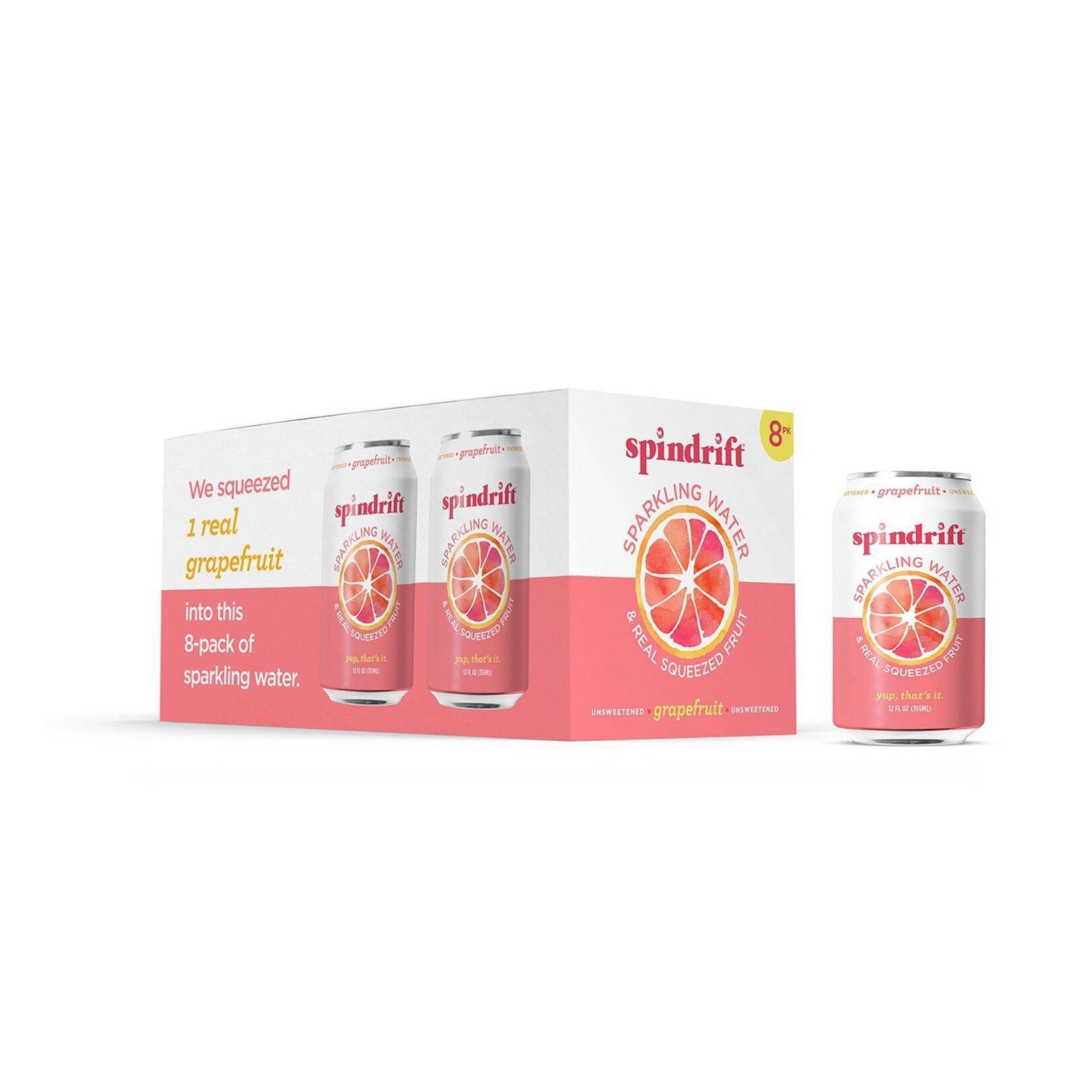 u0026bull;Pack contains 8 cans of Spindrift Grapefruit Sparkling Water (12 fluid ounces per can)u003cbru003eu0026bull;Containing 10% fruit juice and only 17 calories per canu003cbru003eu0026bull;Unsweetened, no added sugar, gluten-free, non-GMO, kosher, never from concentrateu003cbru003eu0026bull;Lightly carbonated, slightly pulpy, and with a fuller flavor than regular sparkling water, carbonated water, and seltzer water