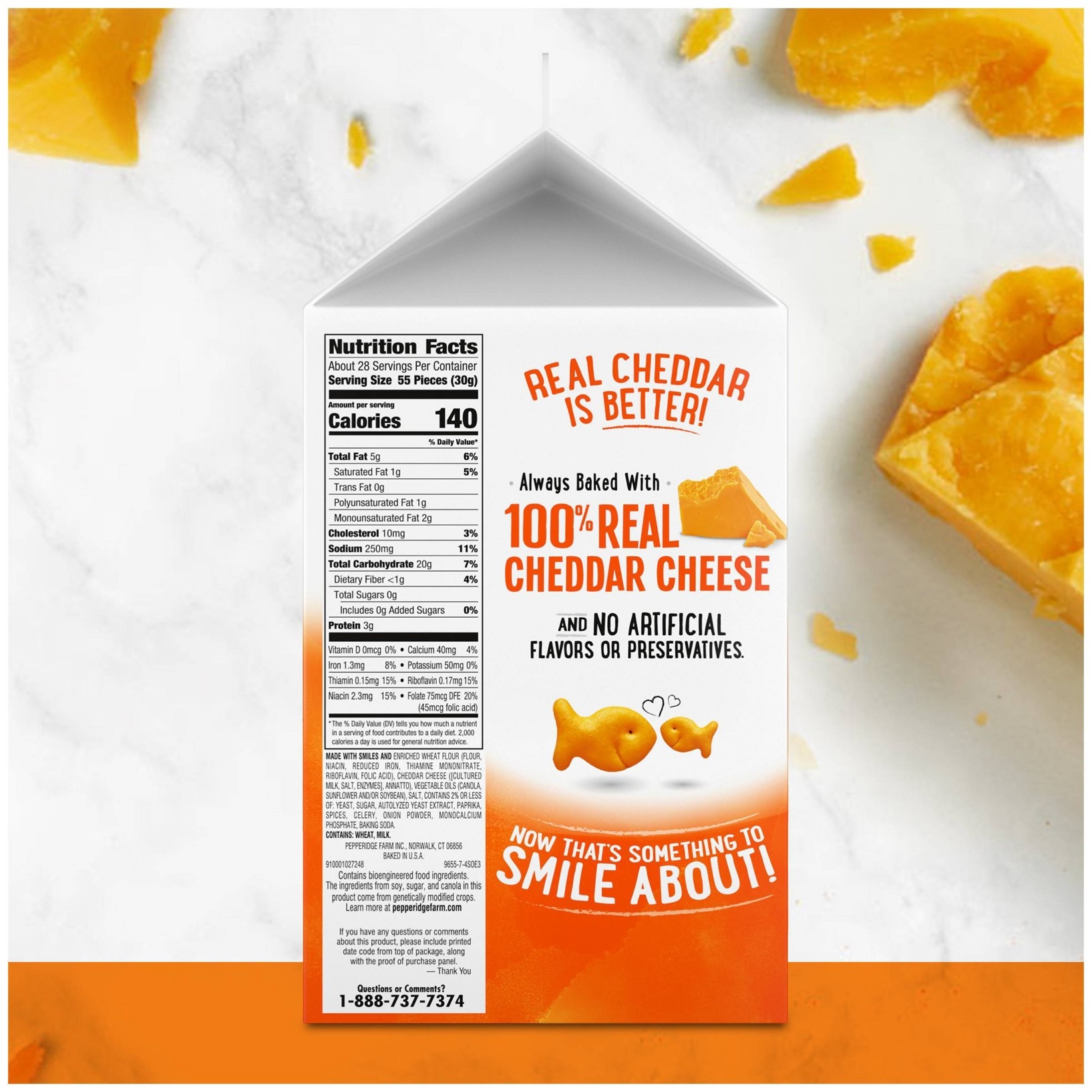 u0026bull;BAKED WITH REAL CHEESE: Our Goldfish Cheddar crackers are a snack-time favorite, always baked with 100% real Cheddar cheeseu003cbru003eu0026bull;A SNACK EVERYONE CAN FEEL GOOD ABOUT: This irresistible little snack is always made with no artificial flavors or preservativesu003cbru003eu0026bull;ALWAYS BAKED, NEVER FRIED: Keep munchable, crunchable Goldfish crackers around for a great on-the-go snacku003cbru003eu0026bull;PERFECT FOR SHARING OR FOR ENJOYING SOLO: The great taste of Goldfish crackers is perfect for hanging out with friends, or taking a snack break any time the mood hitsu003cbru003eu0026bull;ADD EXCITEMENT TO YOUR MEALS: Add Goldfish Cheddar crackers to soups, sprinkle them on salads, or simply serve as a side to your lunchtime sandwich