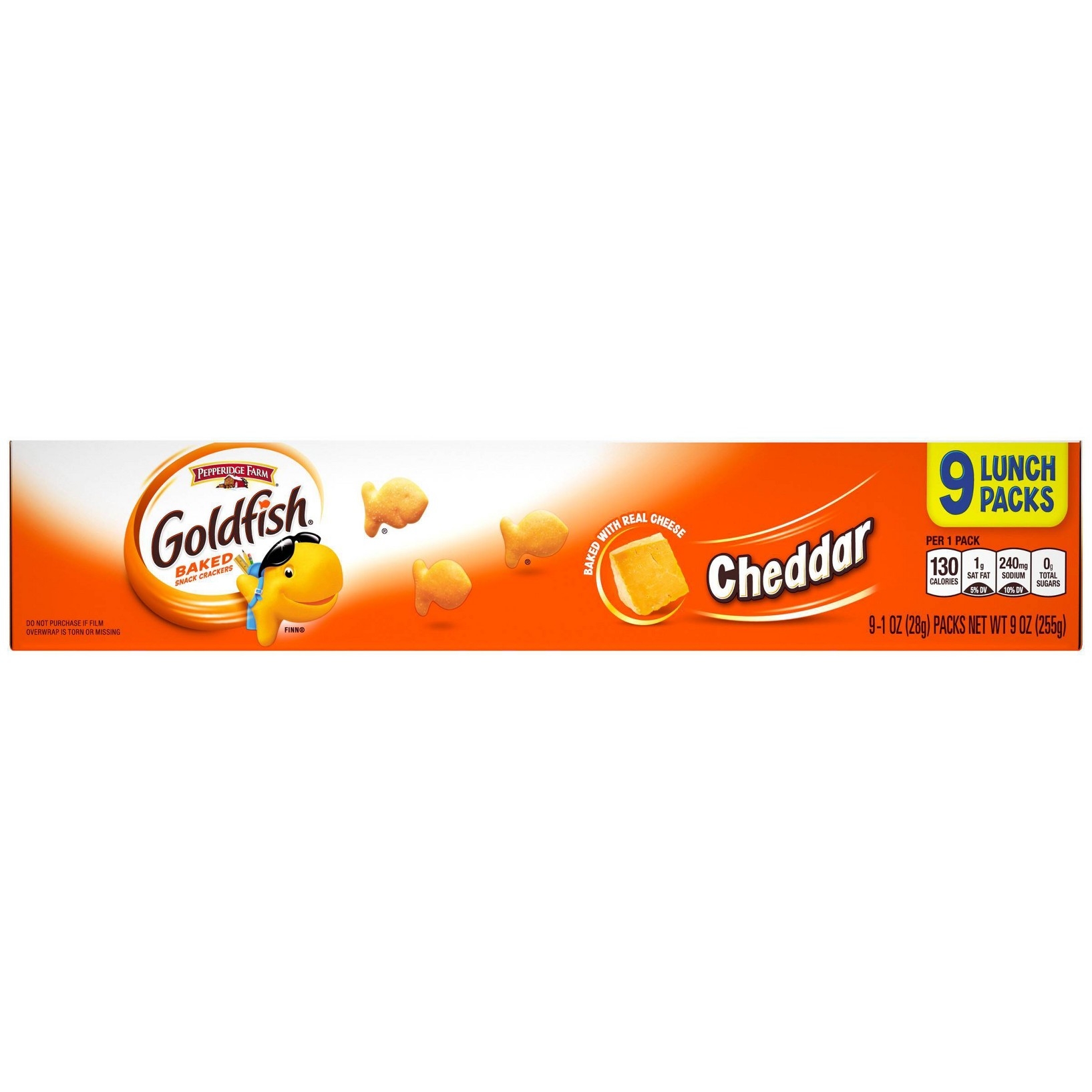 u0026bull;BAKED WITH REAL CHEESE: Our Goldfish Cheddar snack crackers are a crunchable, munchable snack time favorite, always baked with 100% real cheese.u003cbru003eu0026bull;ALWAYS BAKED, NEVER FRIED: Keep munchable, crunchable Goldfish crackers around for an anytime snack that everyone can feel good about.u003cbru003eu0026bull;PERFECT FOR SHARING OR ENJOYING SOLO: Everyone loves the yummy taste of Goldfish Cheddar crackers, so they’re perfect for hanging out with friends, or taking a snack break from work.u003cbru003eu0026bull;ON-THE-GO SNACK: The 1-ounce bag is the perfect size, whether you are looking for an on-the-go snack or just craving something delicious to munch on while streaming your favorite show.u003cbru003eu0026bull;9 SNACK PACKS: The convenient multi-pack tray gives you nine 1-ounce snack bags of Goldfish Cheddar crackers, so you have plenty to share or take with you wherever you go.
