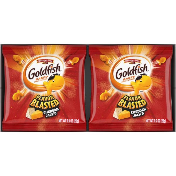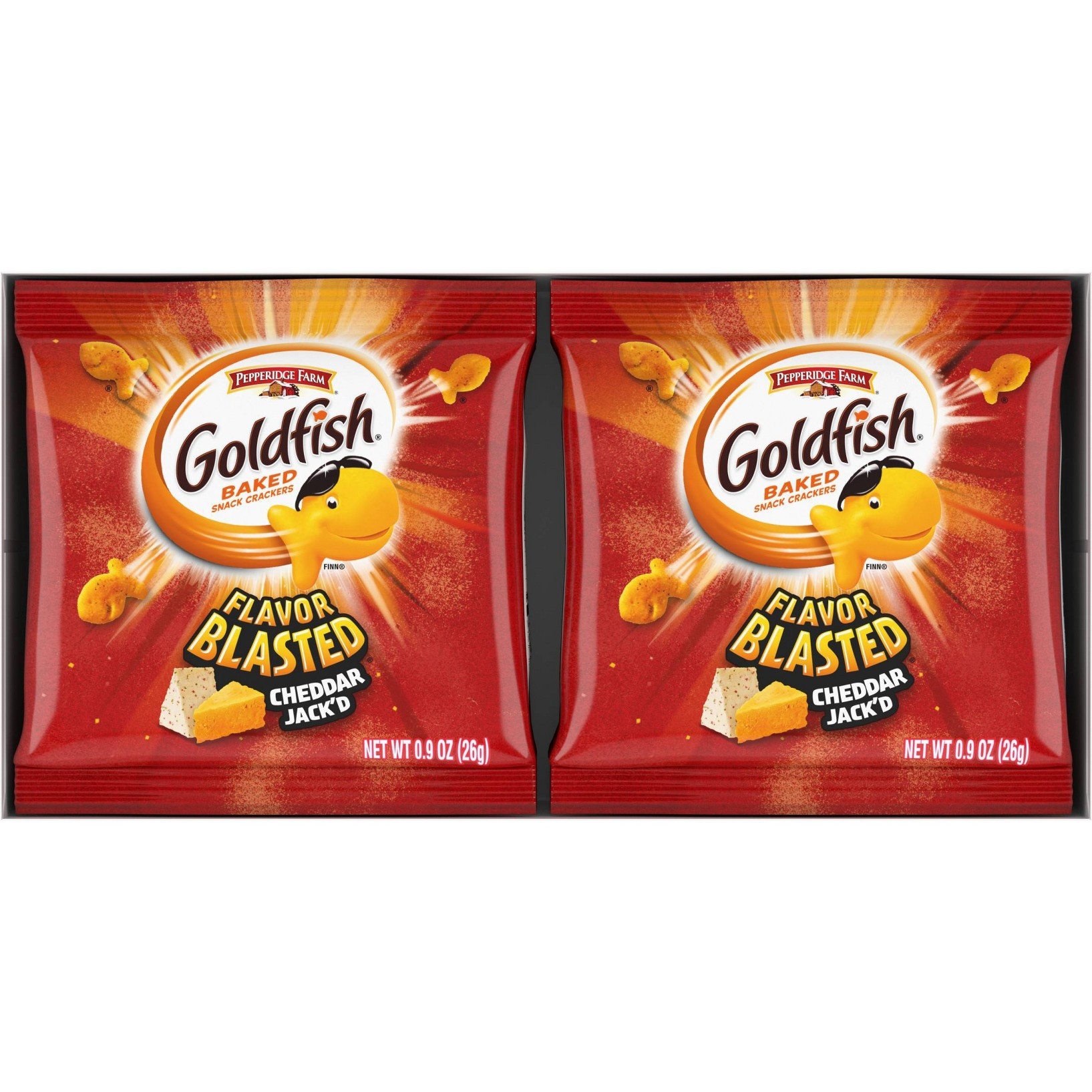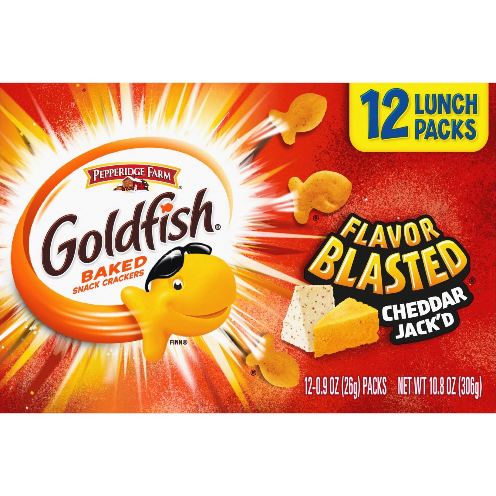 u0026bull;INTENSE FLAVOR: Cheddar Jack’d Flavor Blasted Goldfish crackers are a snack-time favorite, baked with the bold flavor of Cheddar and Jack cheese.u003cbru003eu0026bull;CONVENIENT PACK SIZE: 12 single-serving packs, perfectly portioned for a lunch side or a munchable snack on the go.u003cbru003eu0026bull;A SNACK EVERYONE CAN FEEL GOOD ABOUT: This irresistible little snack is always made with no artificial flavors or preservatives.u003cbru003eu0026bull;ALWAYS BAKED, NEVER FRIED: Keep munchable, crunchable Goldfish crackers around for an anytime snack that everyone can feel good about.u003cbru003eu0026bull;PERFECT FOR SHARING OR FOR ENJOYING SOLO: The intense flavor of Goldfish Flavor Blasted crackers is perfect for hanging out with friends, or taking a snack break any time the mood hits.