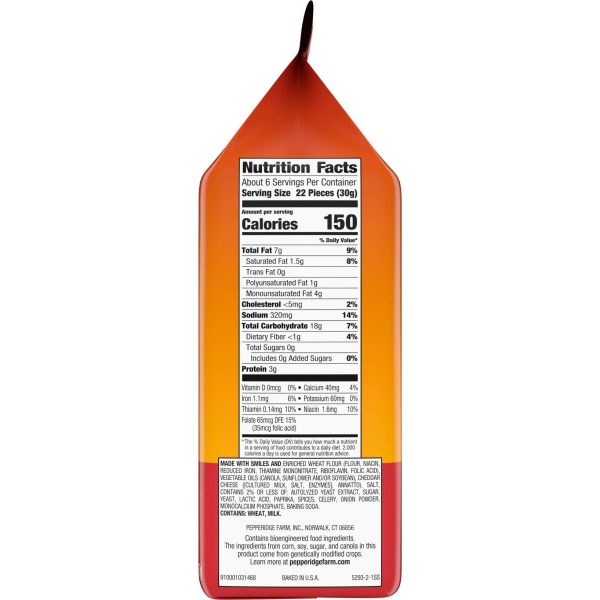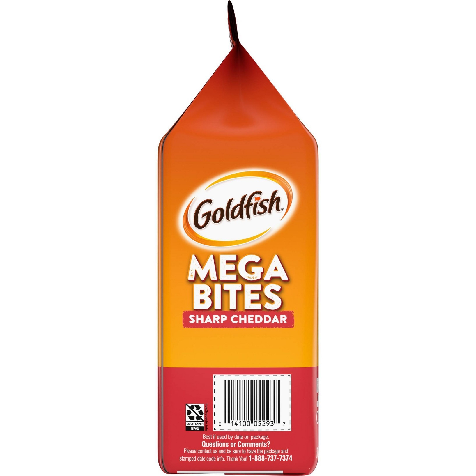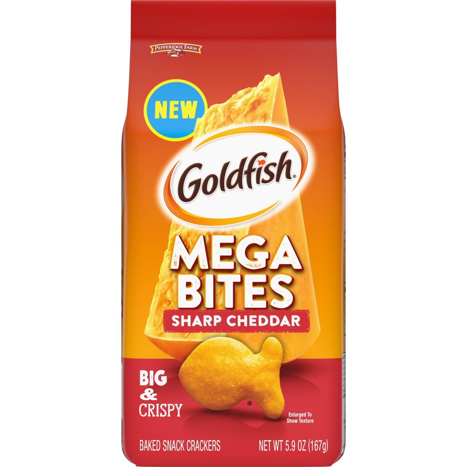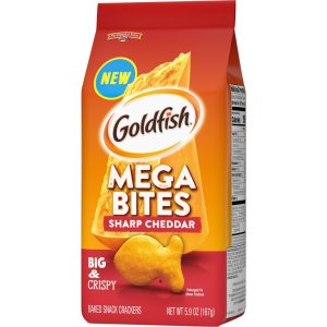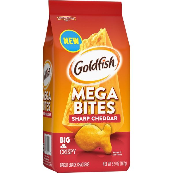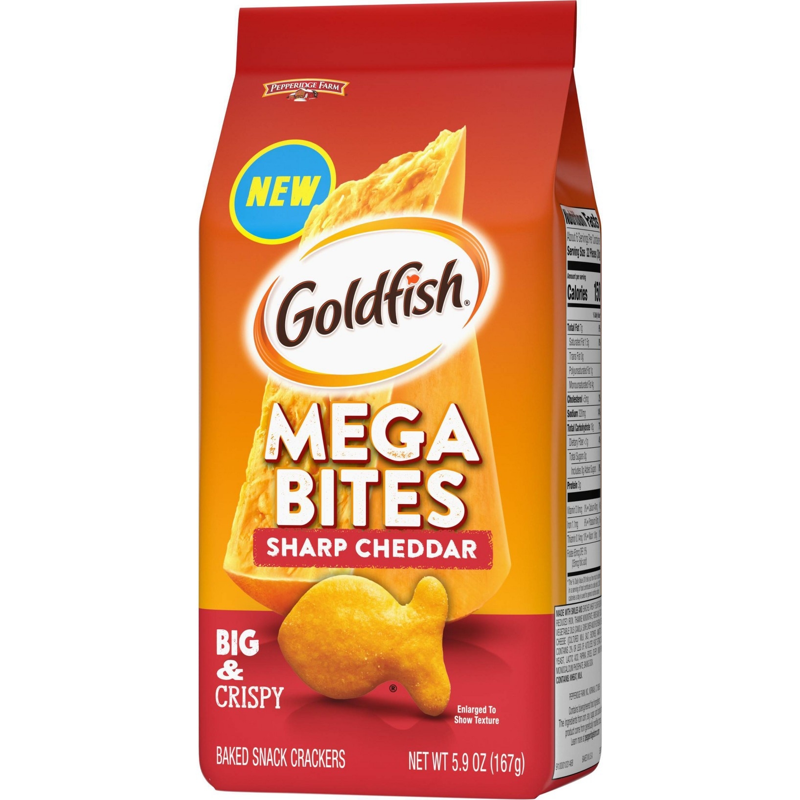 u0026bull;BOLD CHEESE: Big Sharp Cheddar cheese flavoru003cbru003eu0026bull;MEGA BITES: Extra large Goldfish crackers are mega crispy, mega cheesy, mega deliciousu003cbru003eu0026bull;A SNACK EVERYONE CAN FEEL GOOD ABOUT: This irresistible snack is always made with no artificial flavors or preservativesu003cbru003eu0026bull;ALWAYS BAKED, NEVER FRIED: Keep Mega Bites big and crispy Goldfish crackers around for an anytime snack for the whole familyu003cbru003eu0026bull;PERFECT FOR SHARING OR FOR ENJOYING SOLO: The intense flavor of Goldfish Mega Bites crackers is perfect for hanging out with friends, or taking a snack break any time the mood hits