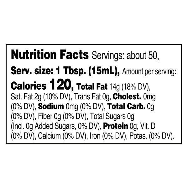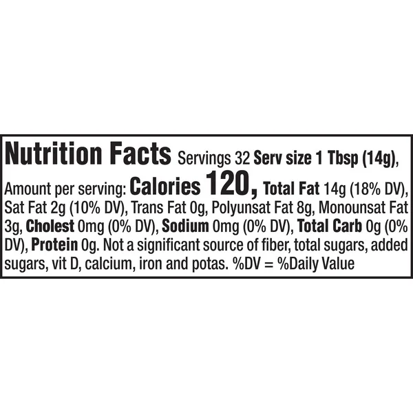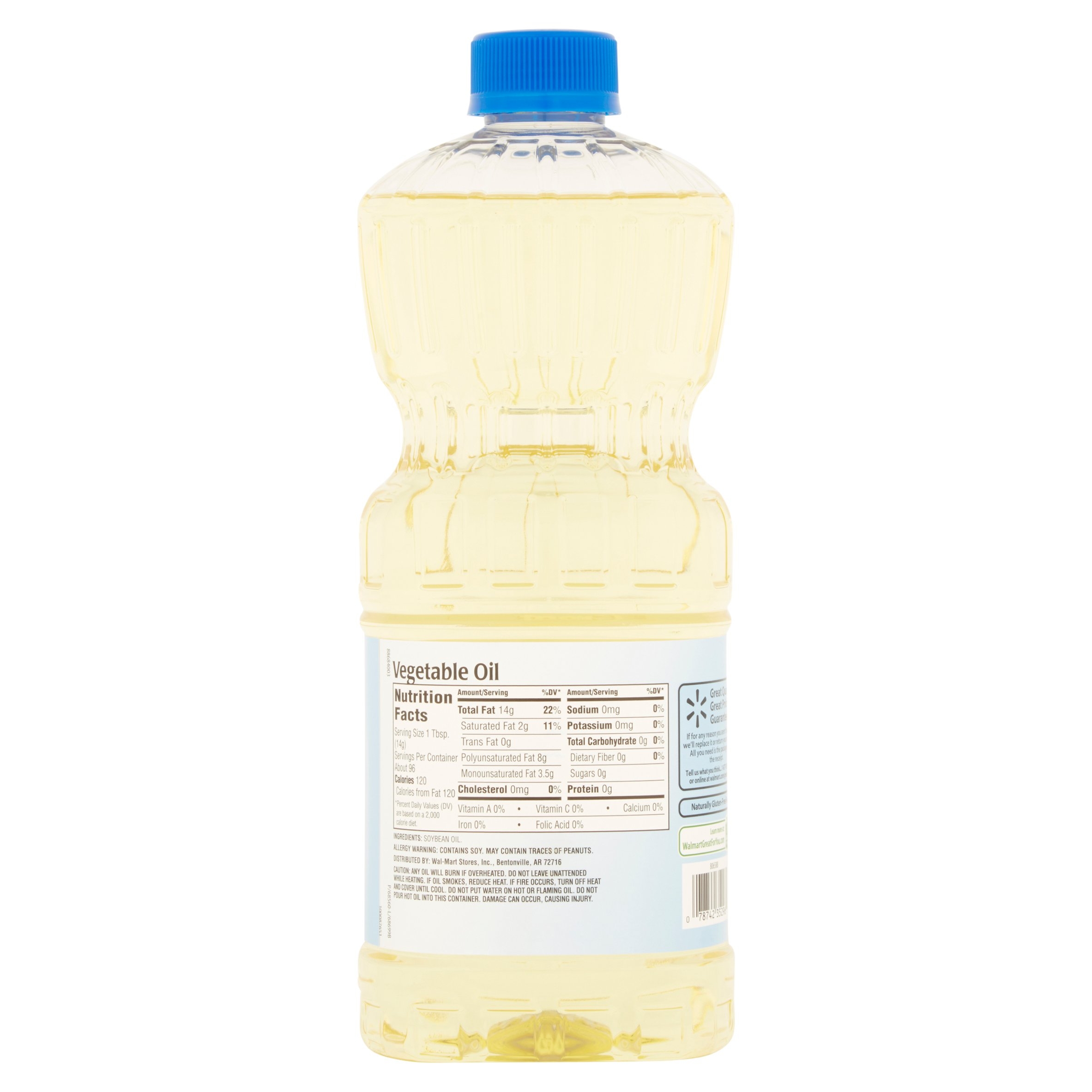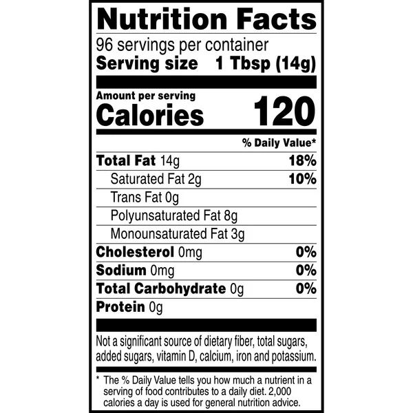 Great Value Vegetable Oil is the perfect choice for all of your cooking needs. The 48-ounce bottle contains 96 servings with only 120 calories and 2 grams of saturated fat per serving. Plus, the value size bottle is only a fraction of the cost of name brand vegetable oils. This versatile cooking oil contains only soybean oil with no preservatives. It is also gluten free and Kosher certified. With a higher smoke point than other oils, vegetable oil is great for frying and baking. You can also use this oil as a blank canvas for yummy salad dressings. Oil made from soybeans is rich in fatty acids, antioxidants, and essential vitamins and minerals. Regardless of what you’re cooking, you can be certain you’re making a healthy choice when you use Great Value Vegetable Oil.