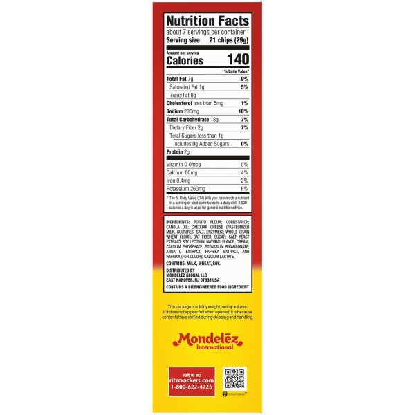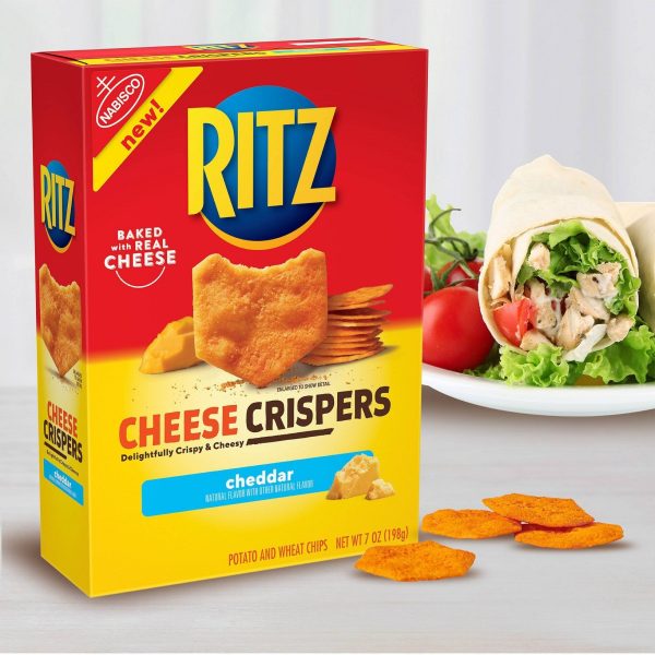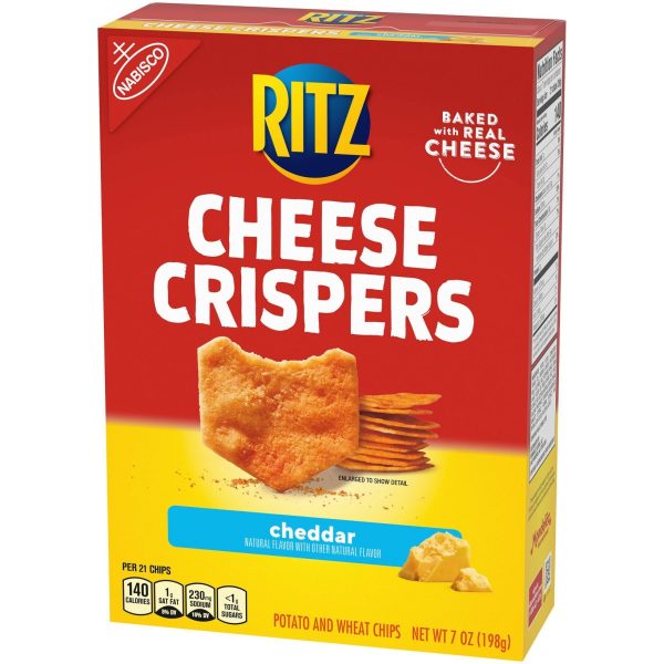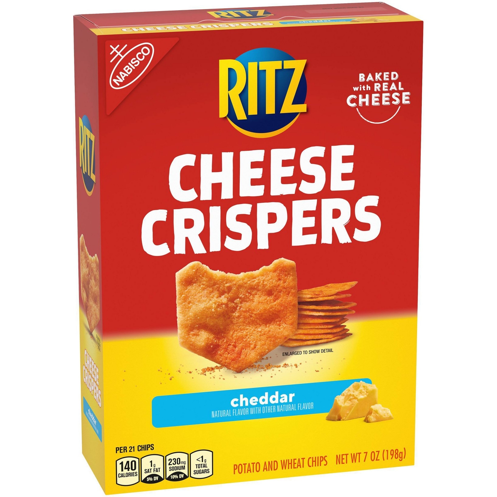 u0026bull;One 7 oz box of RITZ Cheese Crispers Cheddar Chips u003cbru003eu0026bull;Cheddar cheese cracker chips baked with real cheese and a delightfully crispy texture u003cbru003eu0026bull;These light and airy, bite-sized cheddar cracker chips are great for any snacking occasion u003cbru003eu0026bull;These oven baked chips are delightfully cheesy and crispy for a satisfying crunch u003cbru003eu0026bull;Grab these delightfully crispy and cheesy potato and wheat chips for your next social occasion