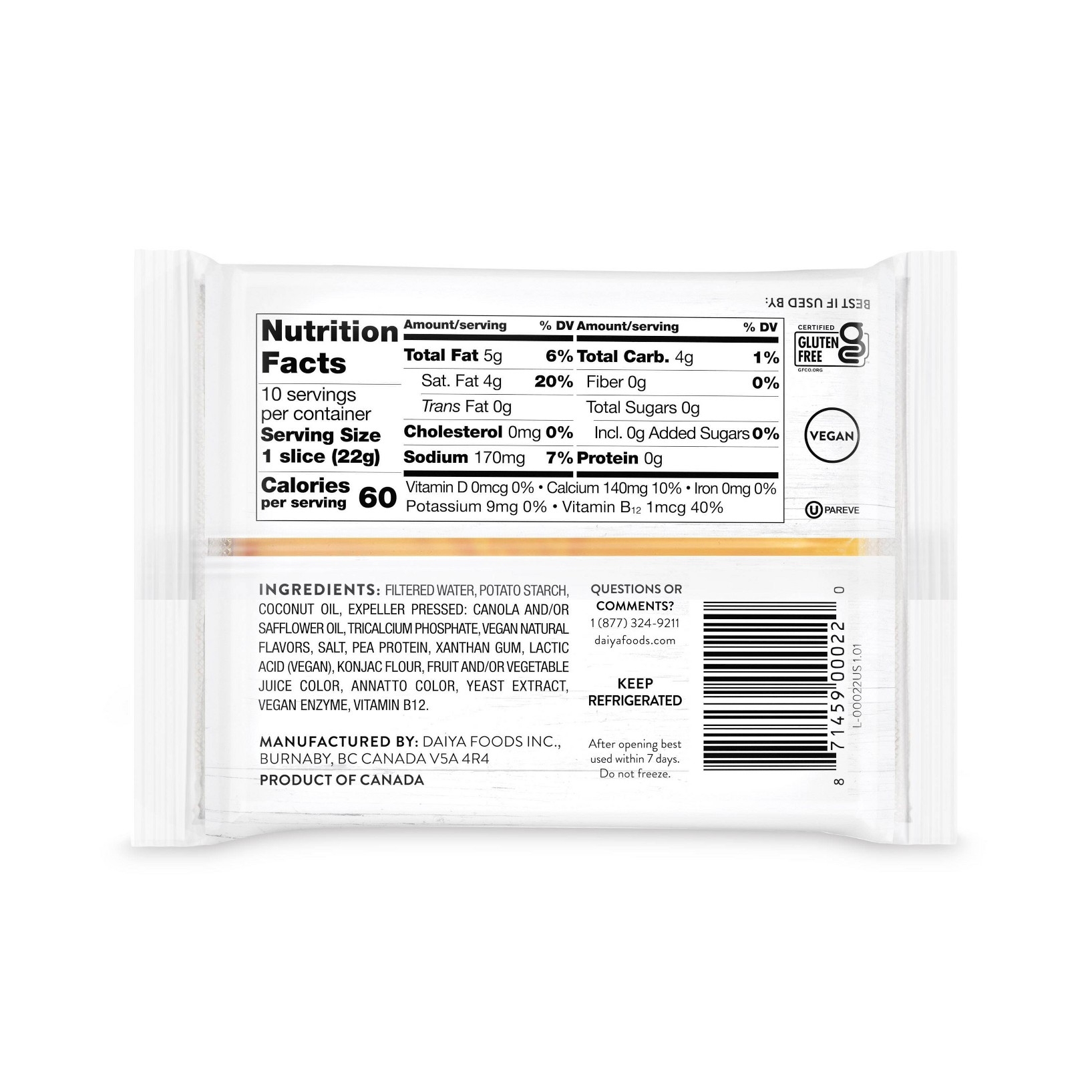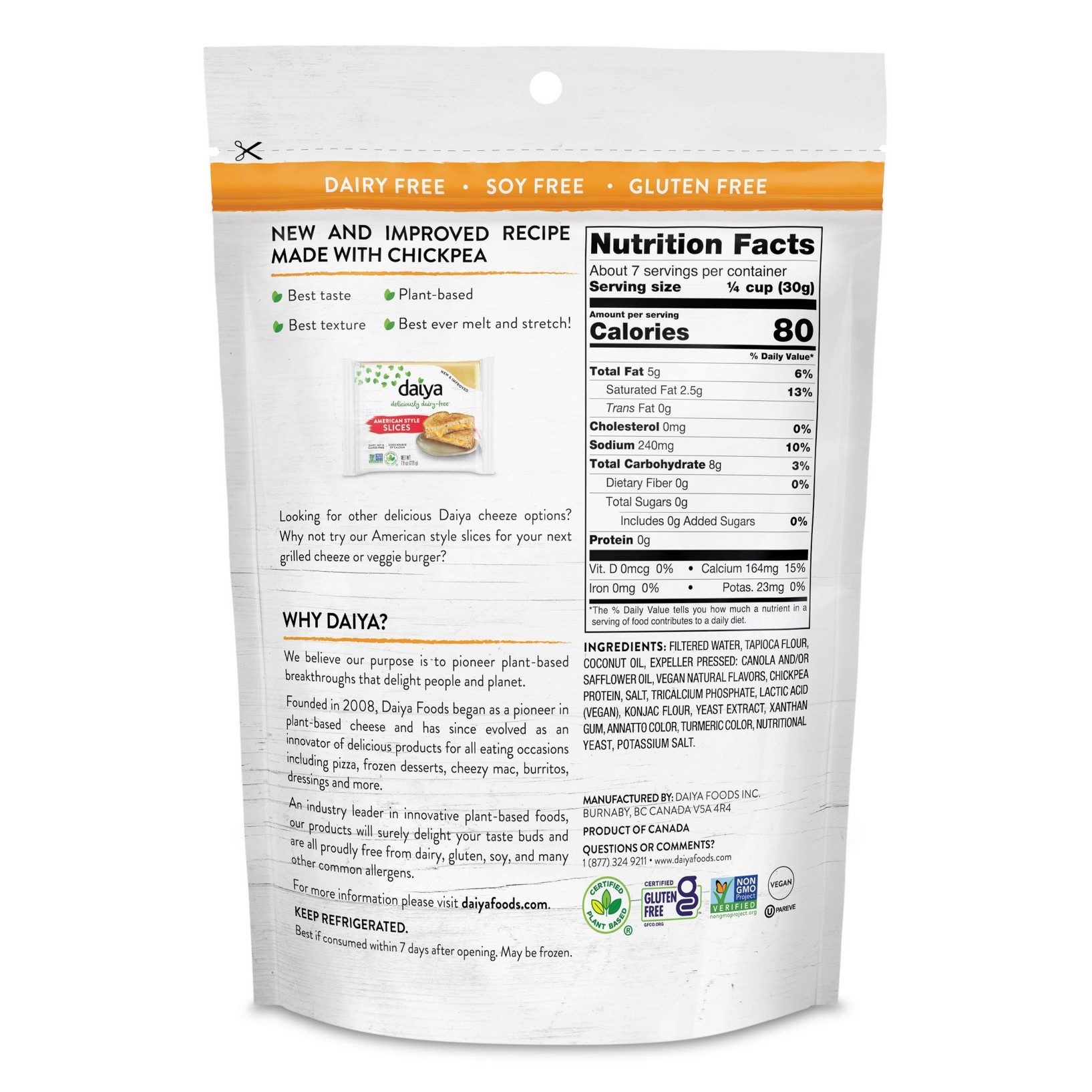u0026bull;ALLERGY-FRIENDLY – Our Daiya cheeze slices are free of most common allergens including dairy, gluten, soy, eggs, nuts, peanuts, shellfish u0026 fish, so you can indulge your dairy free cheese dreams without worry (or you know, side effects…).u003cbru003eu0026bull;VEGAN CHEESE THAT MELTS – At Daiya we’ve been perfecting our plant based cheeses for years and we’re delighted to say, we’ve nailed it. Get the melt and the delicious rich taste that you expect only to find in dairy-based cheese.u003cbru003eu0026bull;PLANT POWERED DELICIOUSNESS – We use only the finest plant-based ingredients in our vegan cheese – certified by Plant Based Foods Association. No artificial colors, flavors, or preservatives – nothing but natural goodness.u003cbru003eu0026bull;ENDLESS DAIRY FREE POSSIBILITIES – Anything dairy can do, our dairy free cheese slices can do – vegan! Sky’s the limit on your cheezy plant based creations.u003cbru003eu0026bull;TRY ALL 6 CHEEZE SLICE FLAVORS – With American Style, Smoked Gouda Style, Cheddar Style, Mozzarella Style, Swiss Style and Provolone Style – Daiya has a delicious plant based cheese slice for all of your cheeze needs.