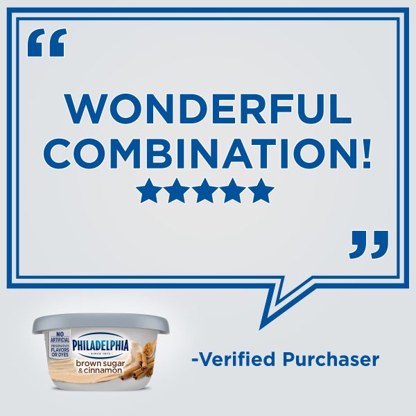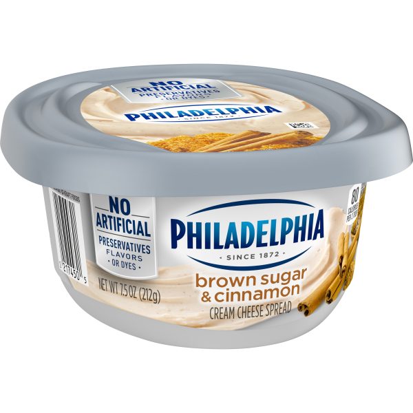 Philadelphia Brown Sugar and Cinnamon Cream Cheese Spread adds sweet creaminess to your favorite dishes and foods. It’s made with brown sugar and cinnamon for a smooth, sweet flavor. This Philadelphia cream cheese spread doesn’t have artificial preservatives, flavors or dyes and is made with farm fresh milk and real cream for that classic taste you love. Use this brown sugar and cinnamon cream cheese spread to bring delicious flavor to your breakfast bagel, or add it to dessert recipes to make decadent brown sugar cream cheese frosting. Mix up a cream cheese dessert spread dip to serve with fresh fruit. Each 7.5 ounce tub is conveniently resealable and should remain refrigerated.