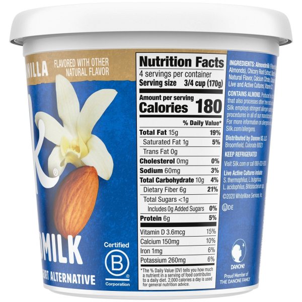 u0026bull;Almondmilk yogurt alternativeu003cbru003eu0026bull;Vanilla flavoru003cbru003eu0026bull;Provides protein* and calciumu003cbru003eu0026bull;*4% DVu003cbru003eu0026bull;Veganu003cbru003eu0026bull;Non-GMO Project Verifiedu003cbru003eu0026bull;Free of dairy, soy, lactose, casein, gluten, and cholesterol