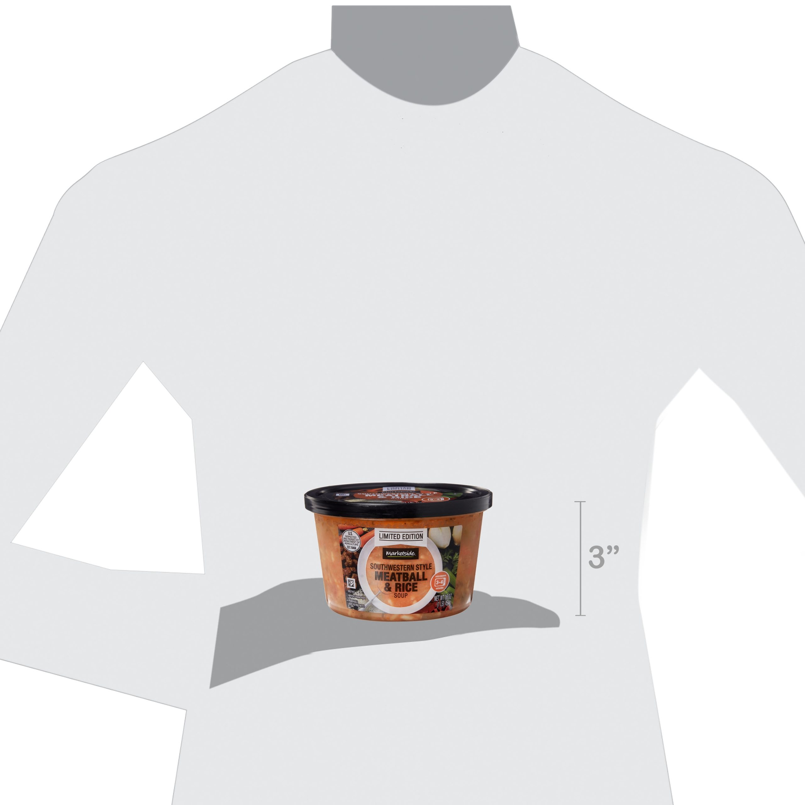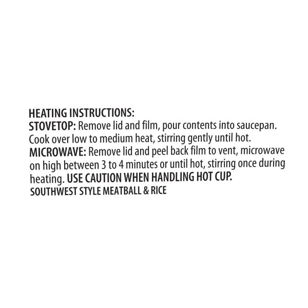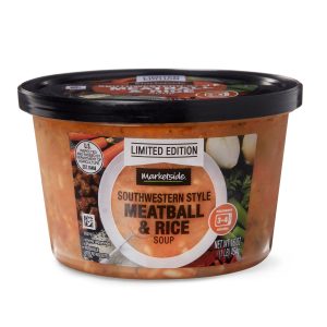Our Marketside Southwestern Style Meatball & Rice Soup is a one-of-a-kind, south-of-the-border, meatball loaded, delicious flavor experience! Your tastebuds are sure to enjoy the diced tomatoes, onions, carrots green peppers and celery all simmered in real chicken stock! We add cilantro, cumin, chipotle, oregano, thyme, and sea salt to make sure the heat is just right and then some Romano cheese with plenty of long grain rice for a taste that brings it all together. This festival of flavor is ready to eat in just 3-4 minutes in the microwave (stirring occasionally). Enjoy a bowl of the ‘Limited Time Only’ Marketside Southwestern Style Meatball & Rice Soup today and let your taste buds thank you!