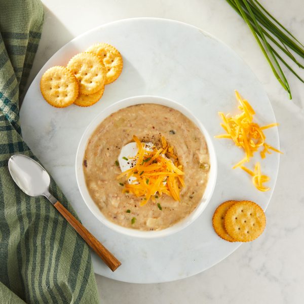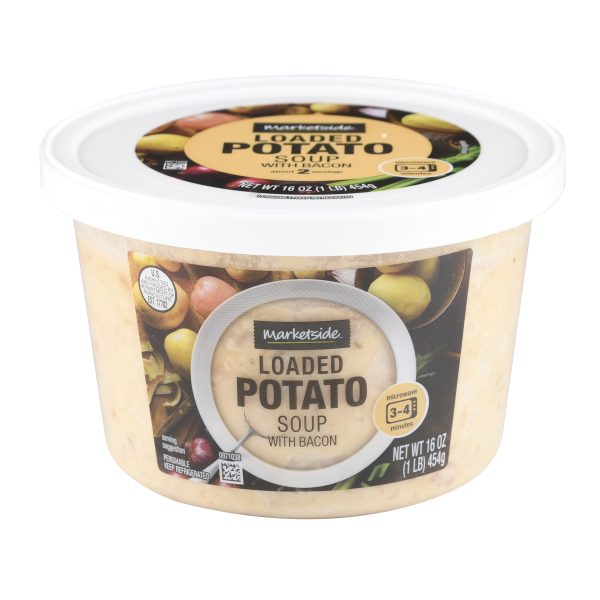 Our Marketside Loaded Potato Soup is full of homestyle cuts of potatoes simmered with a blend of seasonings and uncured bacon all in a rich cream sauce, topped off with chopped scallions and chives. Real handcrafted chicken stock is used, just like it was made at home, so it provides soul-satisfying comfort every time. It’s hearty enough to be a meal by itself and delicious alongside any of your favorite lunch or dinner options. It’s great for quick and easy meals at home, school, or the office. Try serving it with a fresh salad, a yummy sandwich, or on its own. This loaded soup comes in a convenient resealable, microwave-safe container that helps to maintain freshness while making it incredibly easy to heat and enjoy. Simply place in the microwave for 3 to 4 minutes (stirring halfway through) and you have delicious restaurant-style soup ready to go! Take home the Marketside Loaded Potato Soup today!
