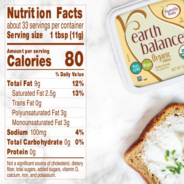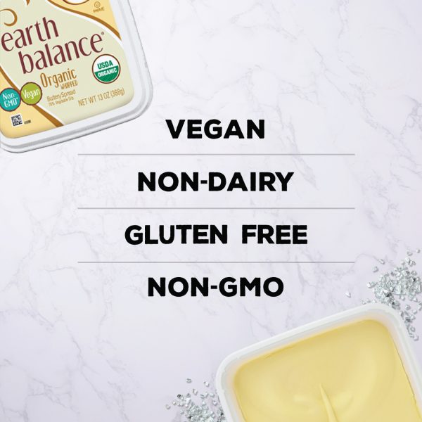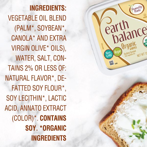 Top your toast, bagels and more with a light, airy buttery delight: Earth Balance Organic Whipped Buttery Spread. This delicious vegan butter alternative is great as a spread or for cooking. It is USDA organic, Non-GMO, and vegan, and contains certified sustainable palm oil. From spreads to snacks, our plant-based products are created with integrity, mindfulness and the goal of having a positive impact. Everything we make is vegan and free of animal products. Plant-based diets are recognized as having a reduced carbon footprint compared to animal-based diets. Go ahead, spread some on … Earth Balance is made for everyone.