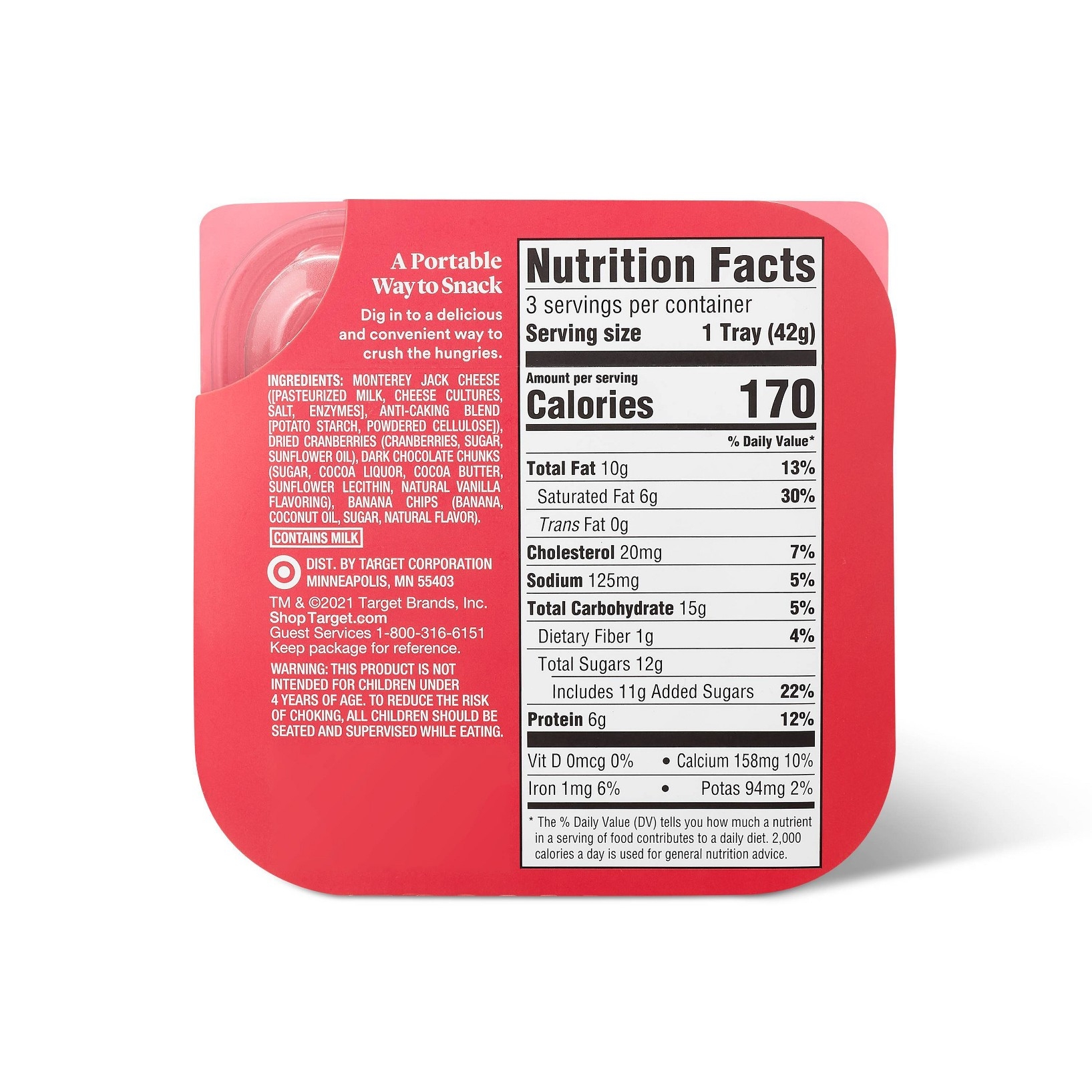 u0026bull;Good u0026 Gather snack pack makes for easy munchingu003cbru003eu0026bull;Bite-sized morsels of Monterey Jack cheese, dried cranberries, dark chocolate, u0026 banana piecesu003cbru003eu0026bull;170cal and 6g protein per serving. See nutrition information for fat and saturated fat contentu003cbru003eu0026bull;Keep refrigeratedu003cbru003eu0026bull;Contains milku003cbru003eu0026bull;Includes 3 packs