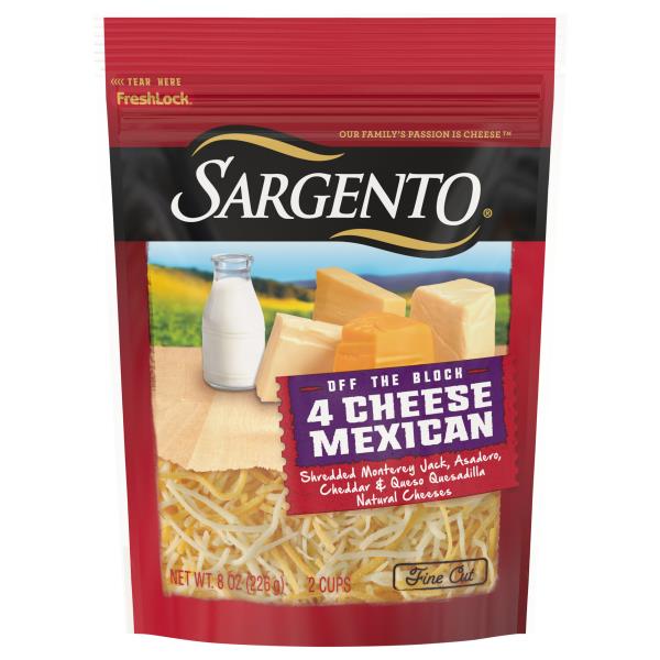 Sargento Off the Block Shredded Cheese, 4 Cheese Mexican, Fine Cut