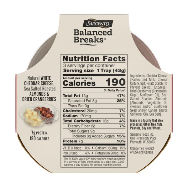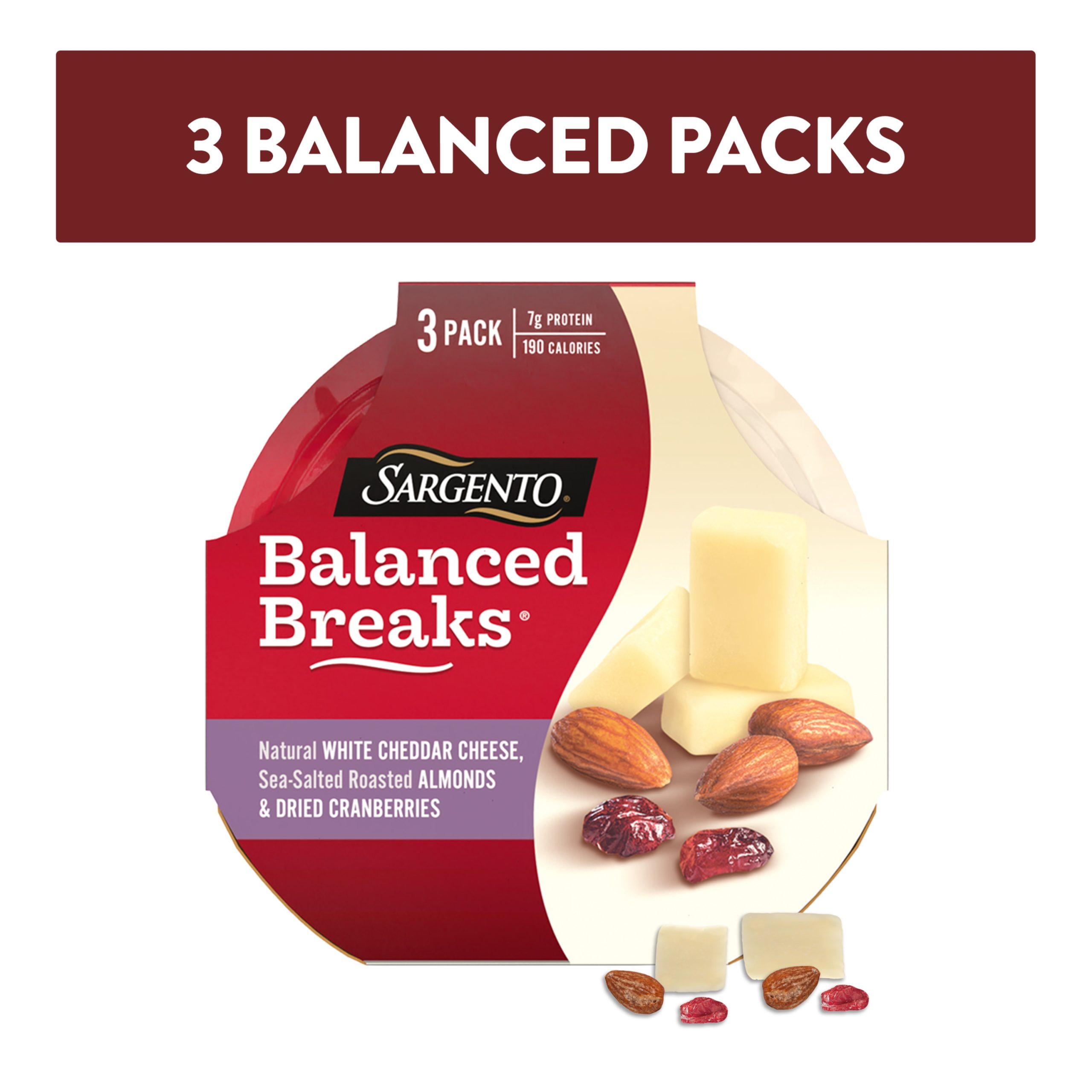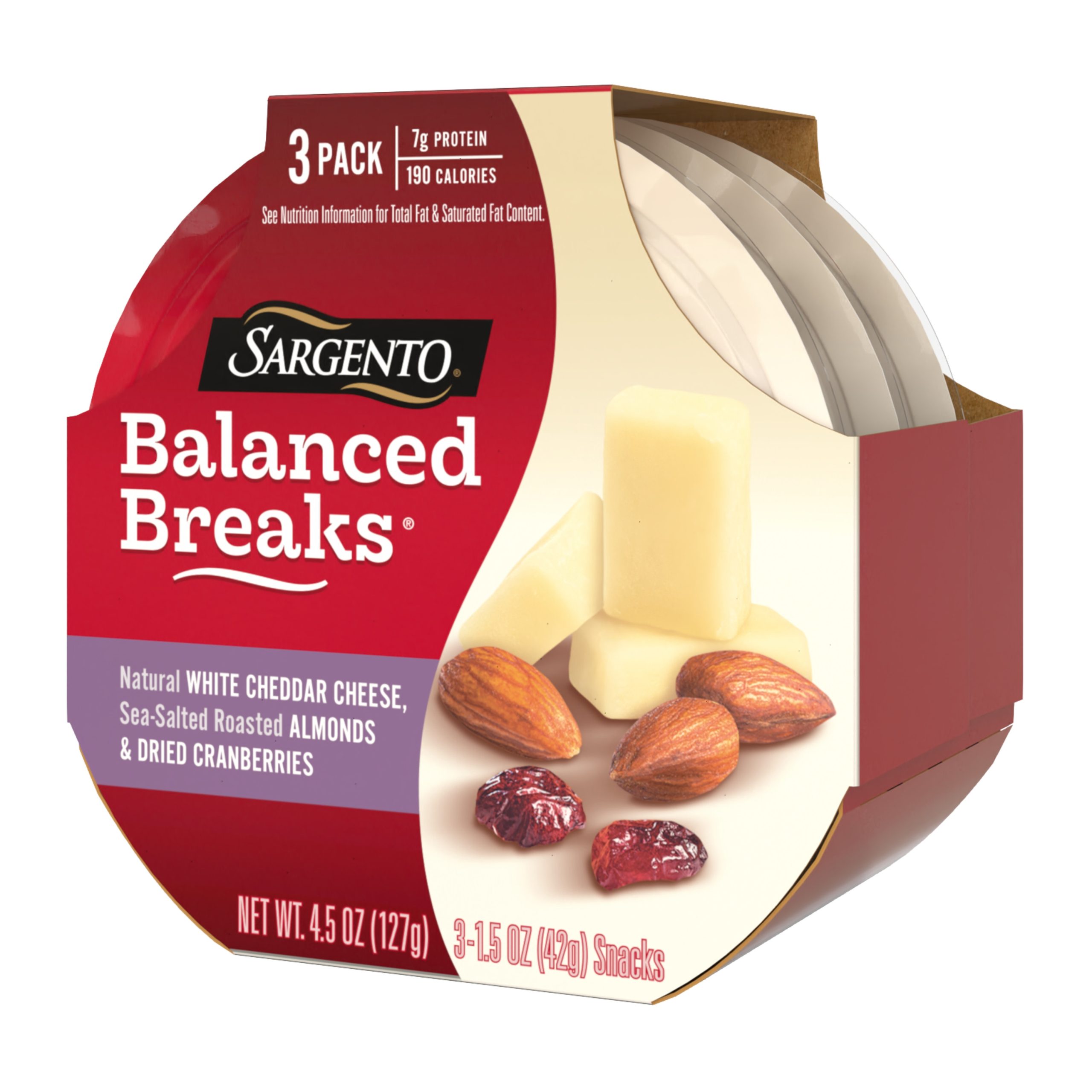 The perfect balance of the flavors you crave, Sargento® Balanced Breaks® Snacks White Cheddar Cheese, sea-salted roasted almonds and tart dried cranberries are combined in one satisfying snack. Balanced Breaks are a snack to toss in backpacks, briefcases and gym bags for a delicious on-the-go. Each convenient individual serving contains 7 grams of protein and 190 calories per serving*.